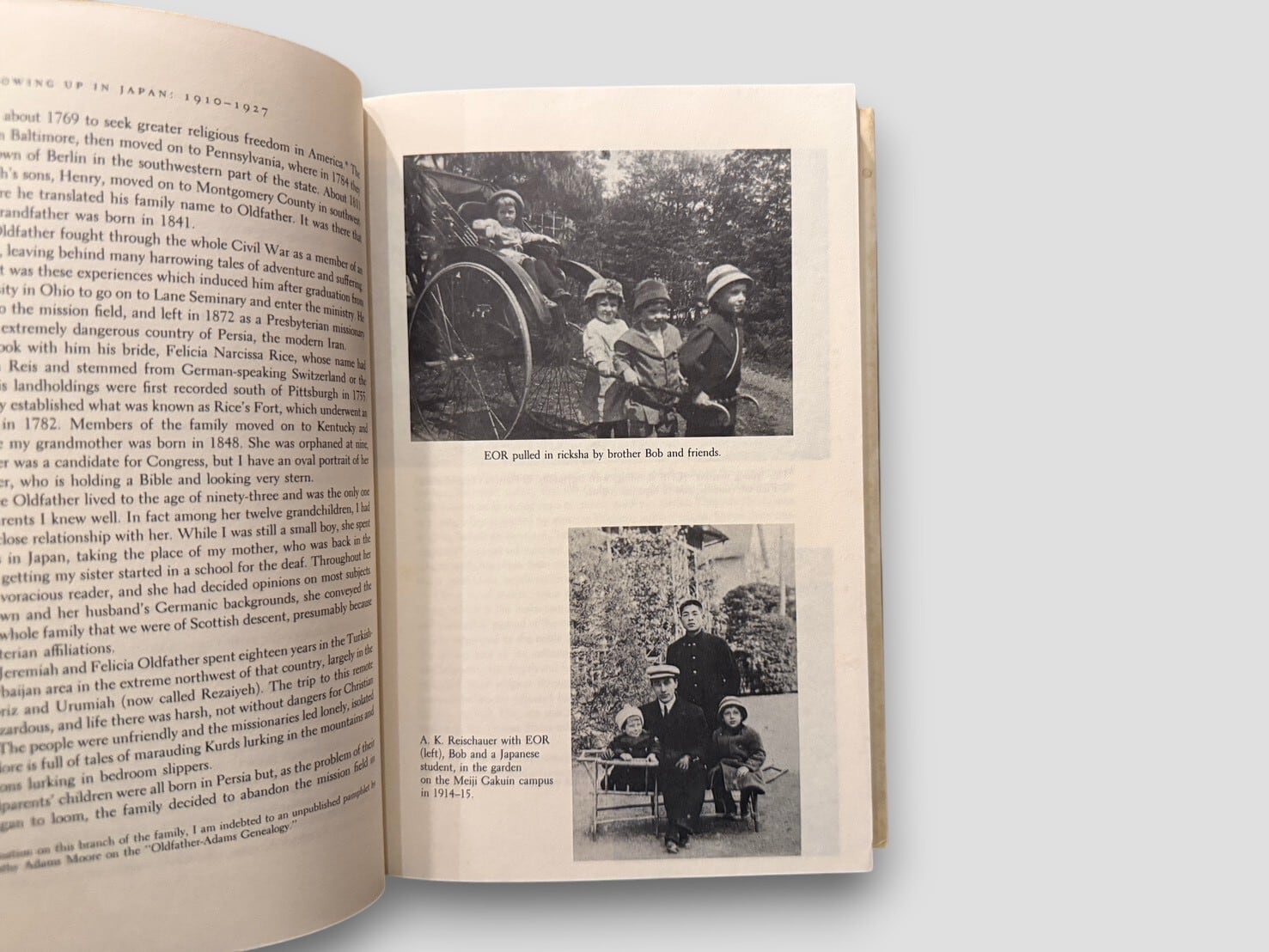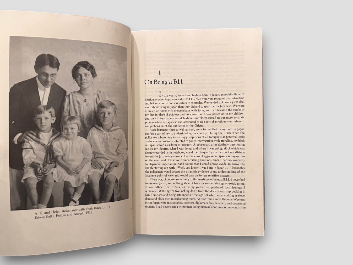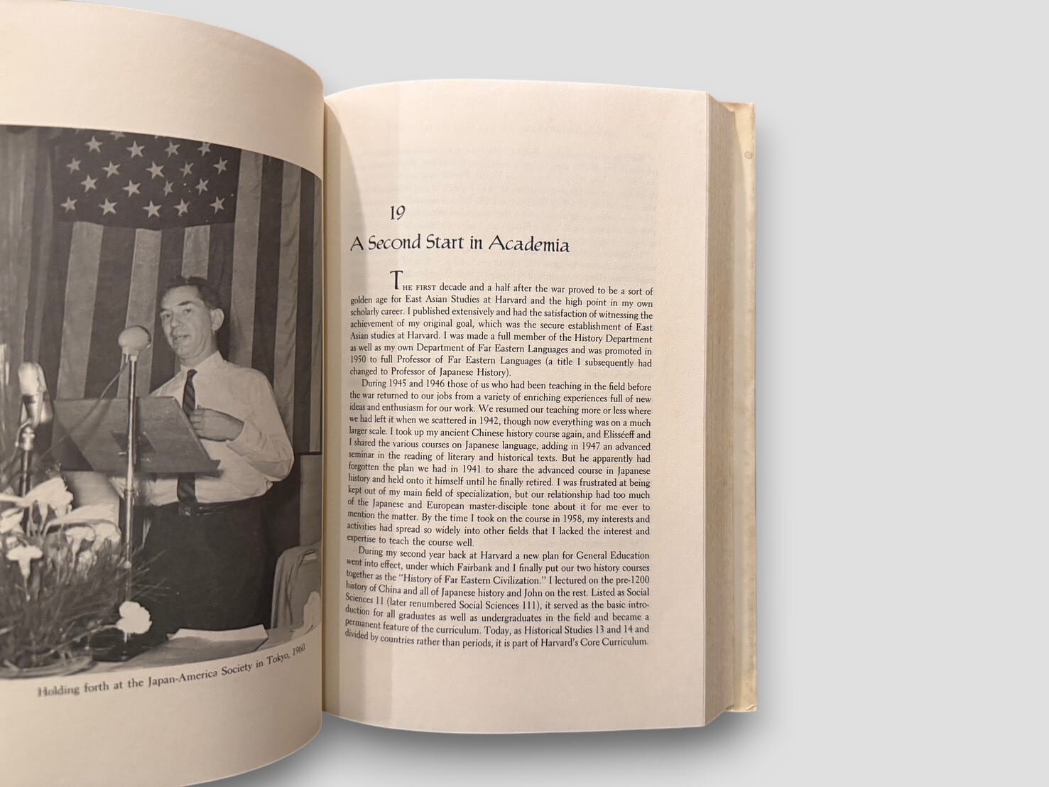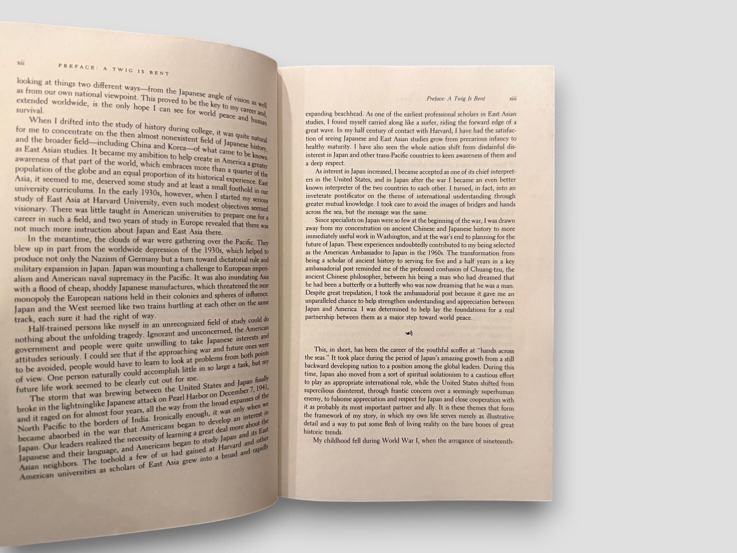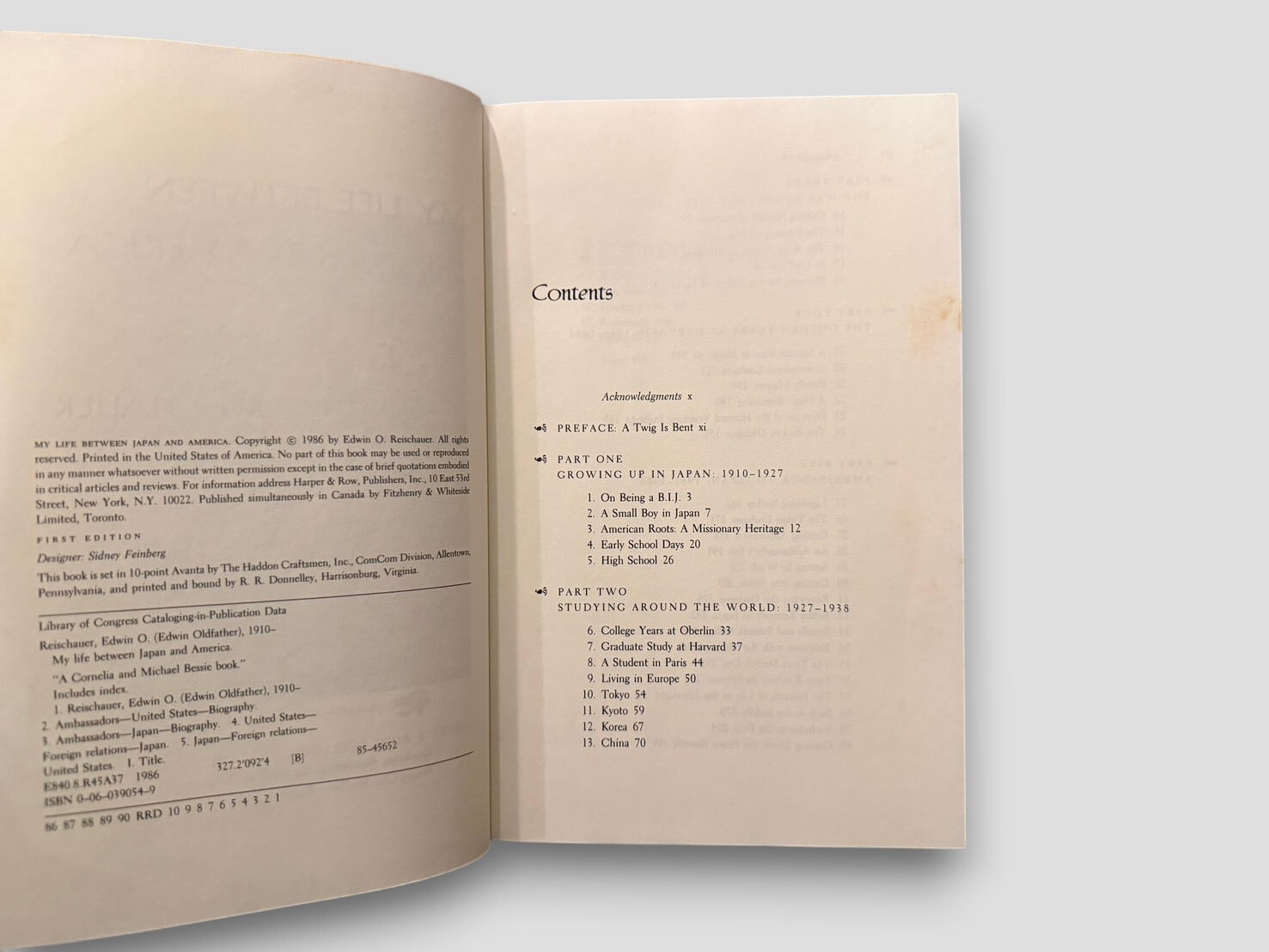構成は6部からなり、“Growing Up in Japan” “Studying Around the World” “The War Years” “The Golden Years at Harvard” “Ambassador to Japan” “Winding Down” によって展開される。図版・写真多数収録。見返しに著者による署名および特定個人宛の献辞あり。1986年初版。個人の歩みを通して、20世紀の日米関係の一断面に触れることができる一冊。