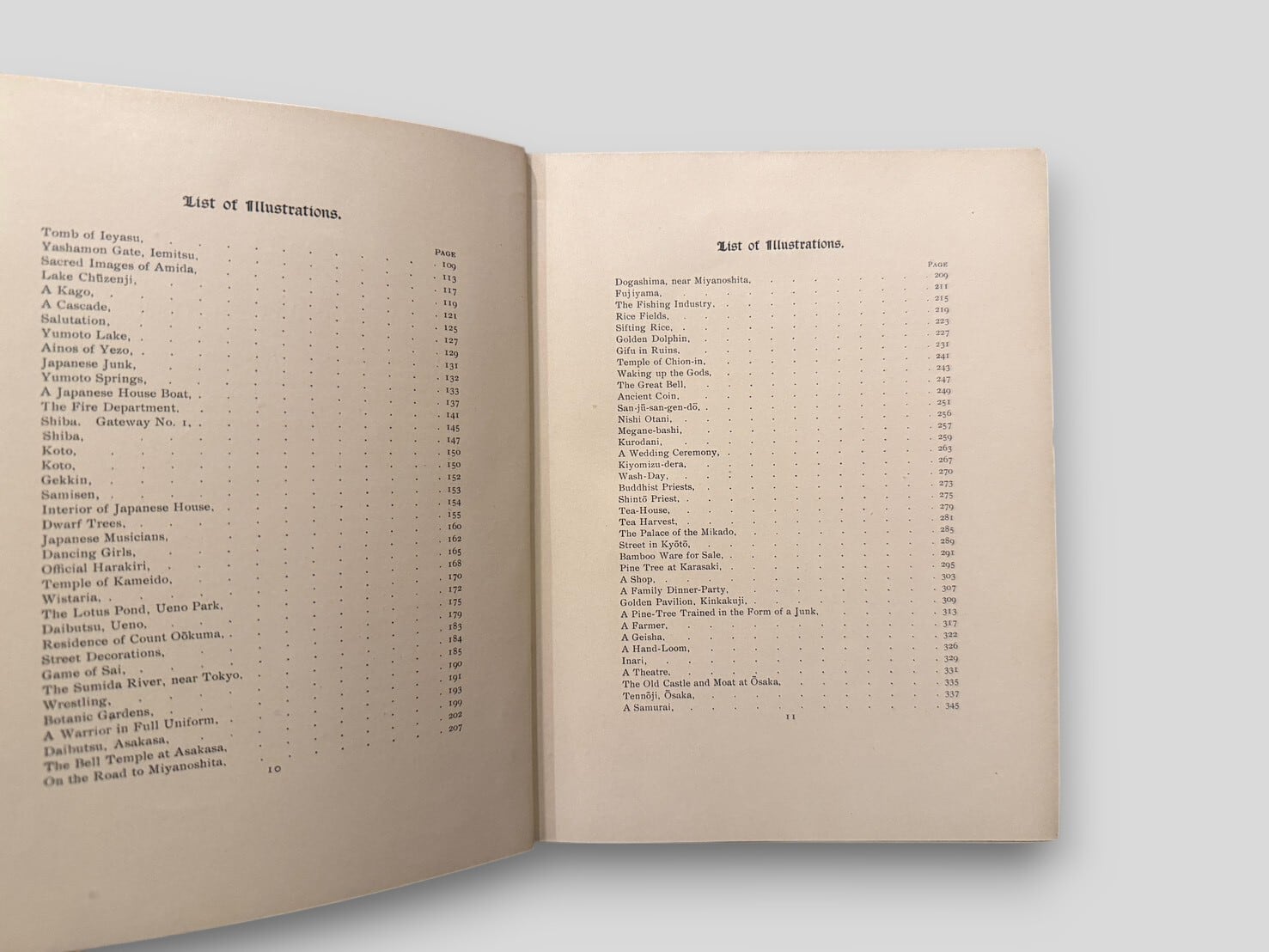 This travel narrative records observations of Japan by Katharine Schuyler Baxter, describing places, customs, and daily life, with illustrations listed in the contents. First edition, published in 1895.