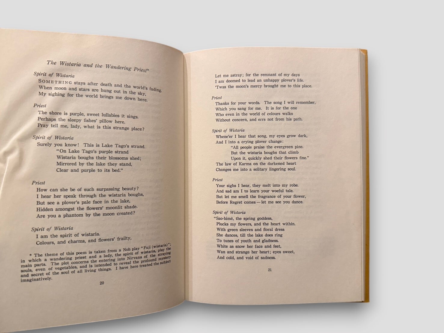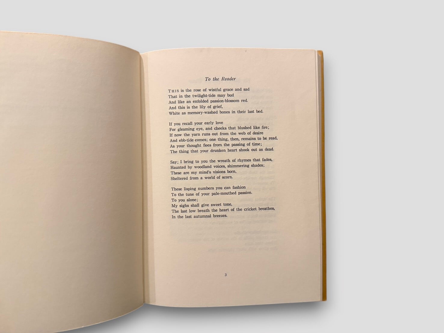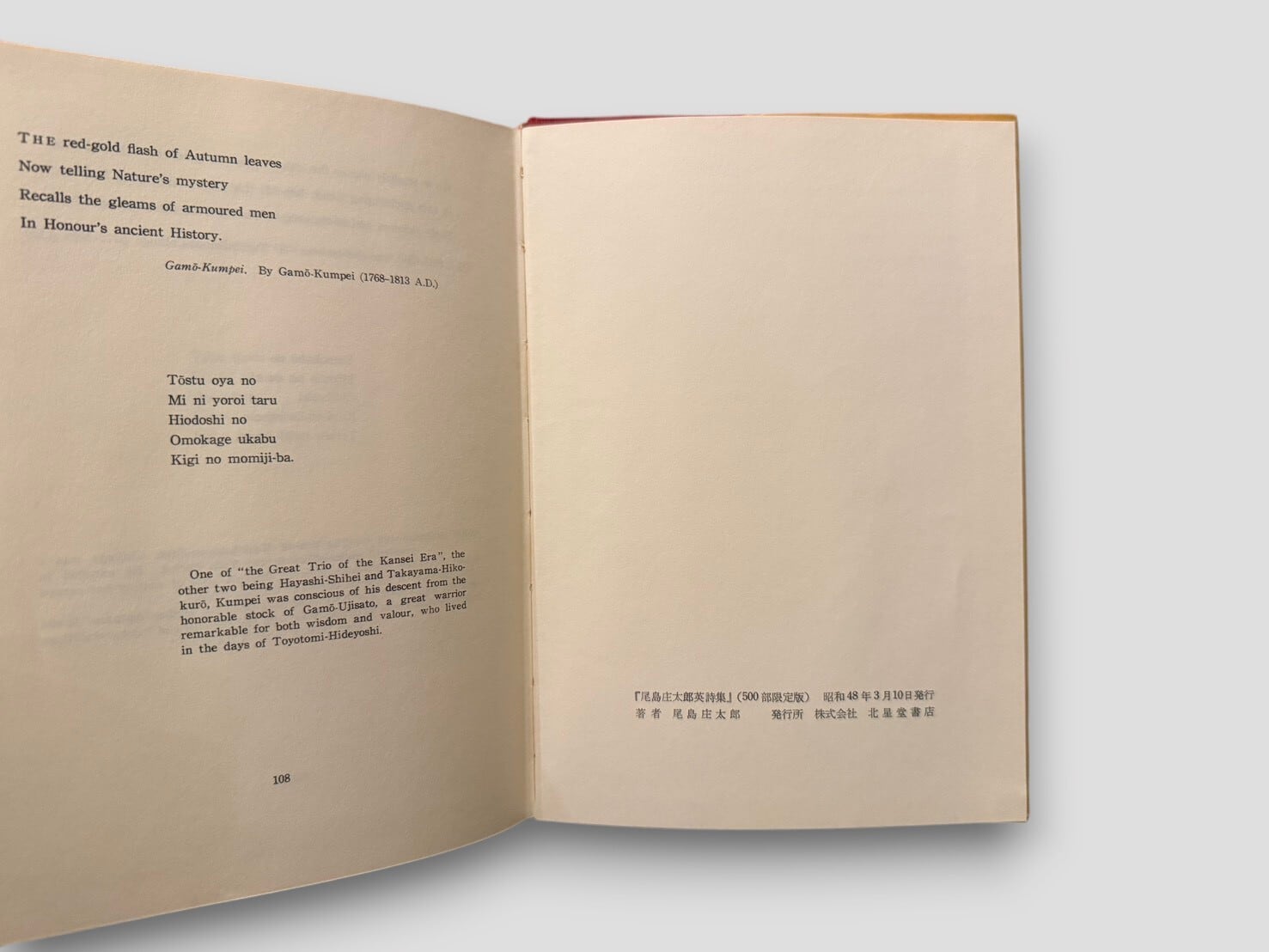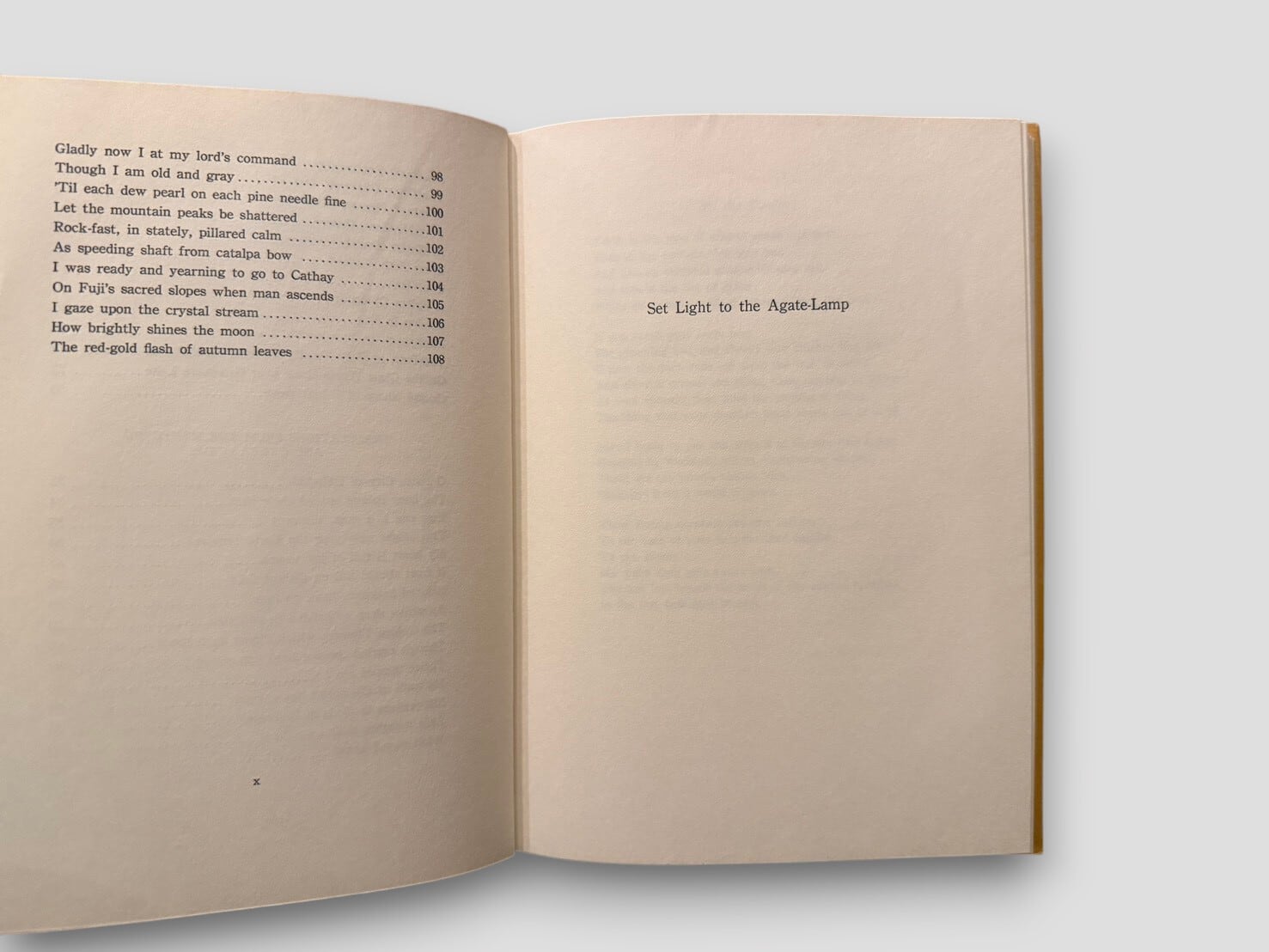 日本人詩人、尾島庄太郎による英語詩集。構成は章立てに分かれ、「Set Light to the Agate-Lamp」および「Translations from the Manyoshu and Other Poems」などの区分が設けられている。巻頭にはEdmund Blundenによる詩が掲載されている。本書は1973年刊行の限定500部うち8部。署名入りの献呈紙片付き。