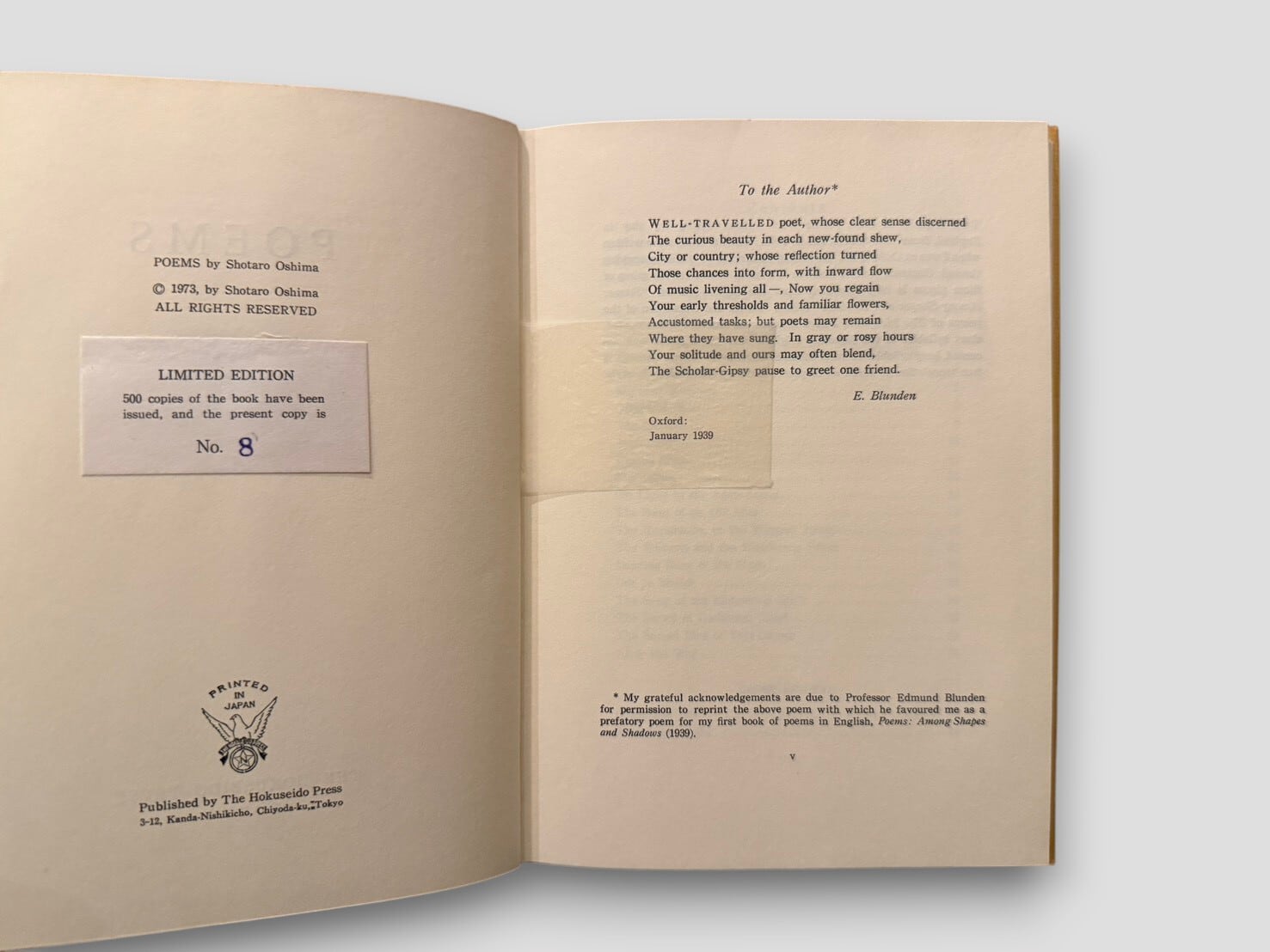 A collection of poems by Shotaro Oshima written in English, with sections including "Set Light to the Agate-Lamp" and "Translations from the Manyoshu and Other Poems" as listed in the contents, and a prefatory poem by Edmund Blunden. The copyright page states 1973, and a limitation label indicates an edition of 500 copies. With a signed presentation slip laid in.