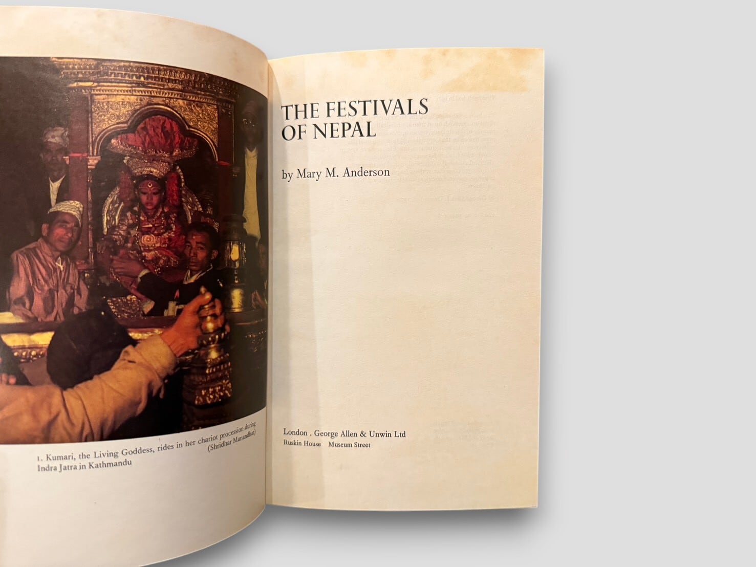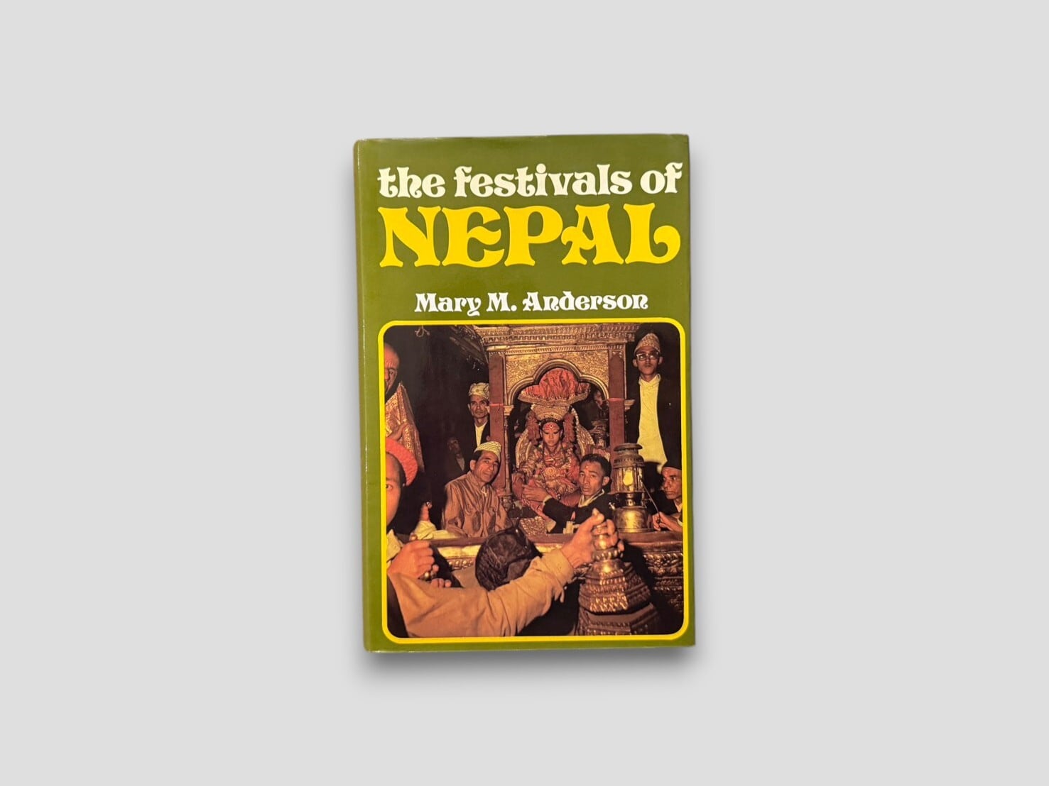 A record of Nepalese festivals by Mary M. Anderson based on her residence in Kathmandu, presenting a chronological account of religious and cultural celebrations throughout the year. The volume includes descriptions of major Hindu and Buddhist festivals with photographic illustrations. First edition, 1971.