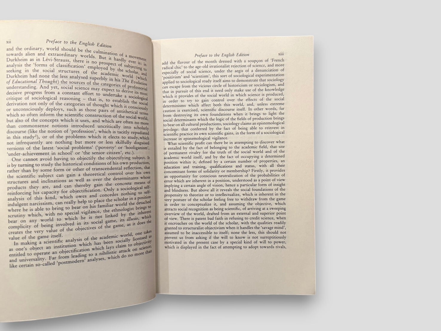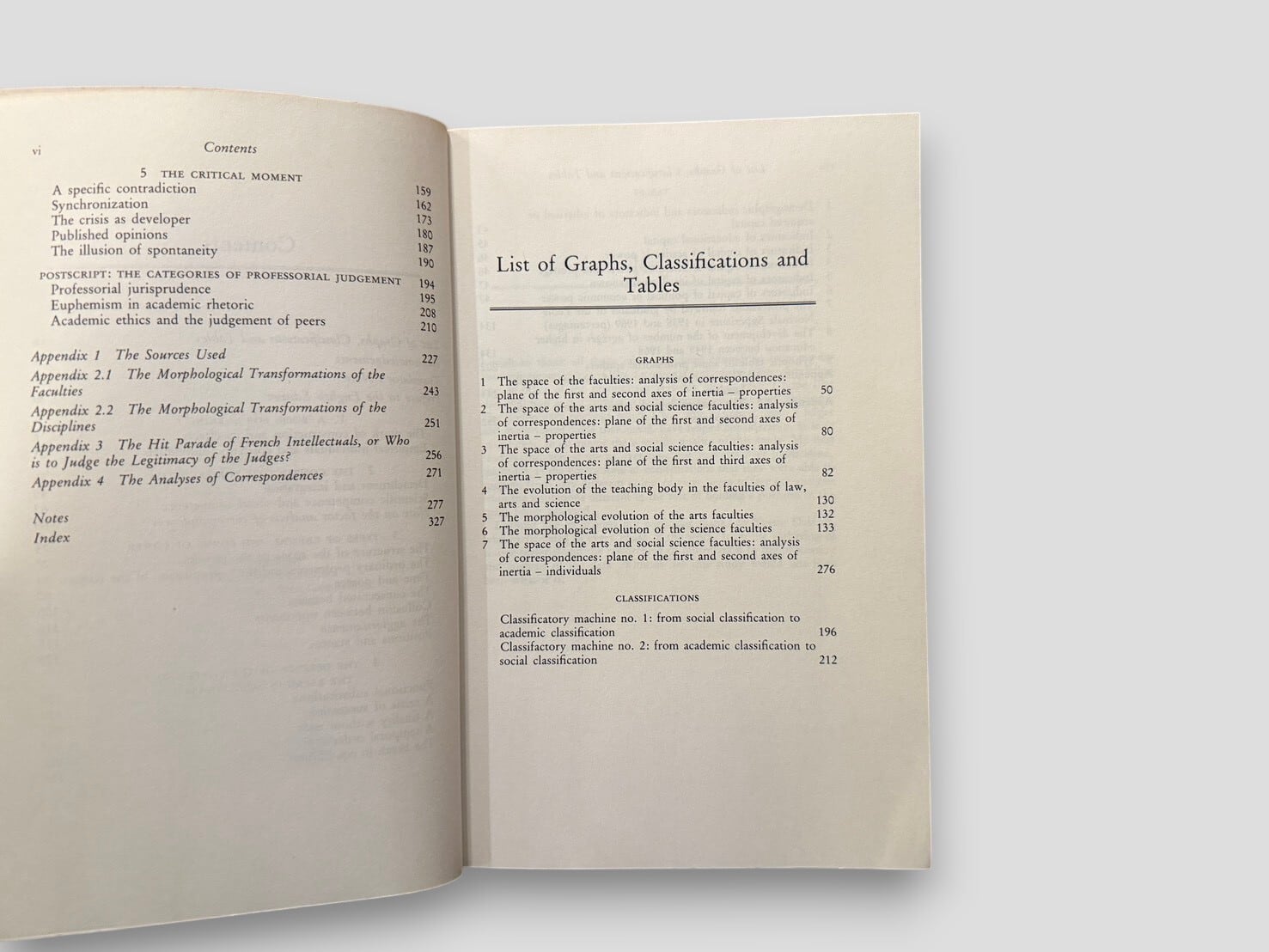 本書では大学という制度内部における権力関係、学問分野間の位置取り、知識人の社会的条件が分析される。統計や対応分析を用い、学術的地位や出身背景、資本の分布がどのように構造化されているかなどが実証的データに基づいて展開される。1989年刊行ペーパーバック版。