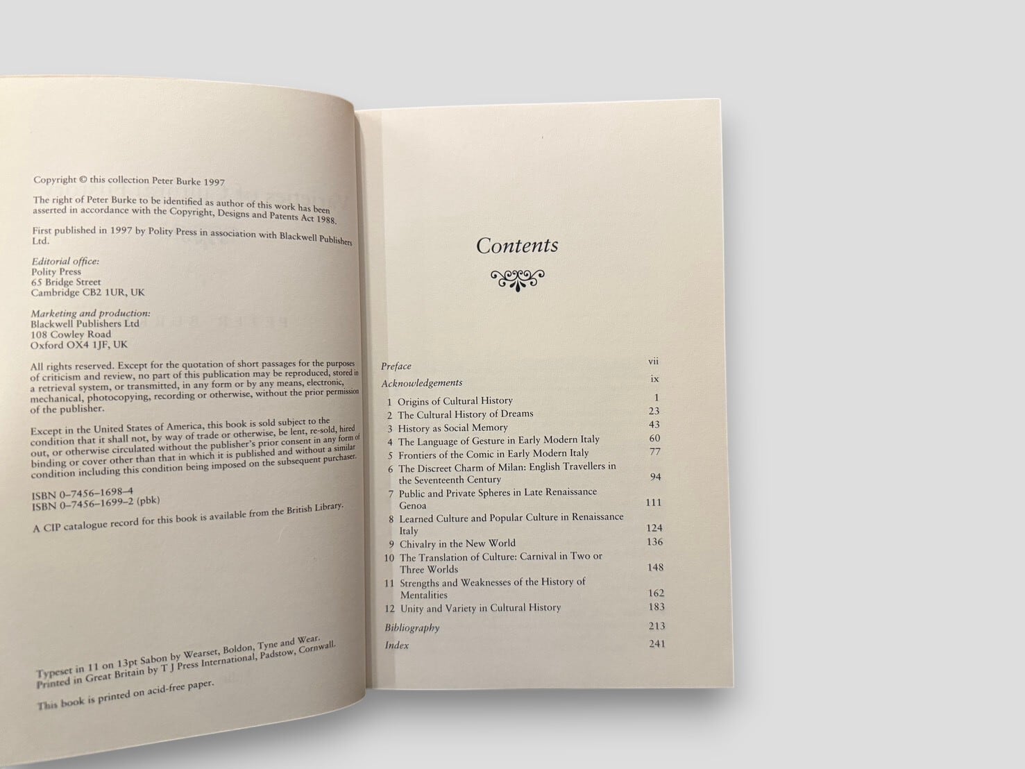本書はピーター・バーク自身による複数の論考から構成される。夢、記憶、ジェスチャー、言語、祝祭といったテーマを通じて、人間の行為や表現がどのように歴史の対象となるかが検討される。初期近代ヨーロッパを中心とした事例に基づき、文化の伝達や変容、新世界との接触が扱われる。1997年刊行ペーパーバック。