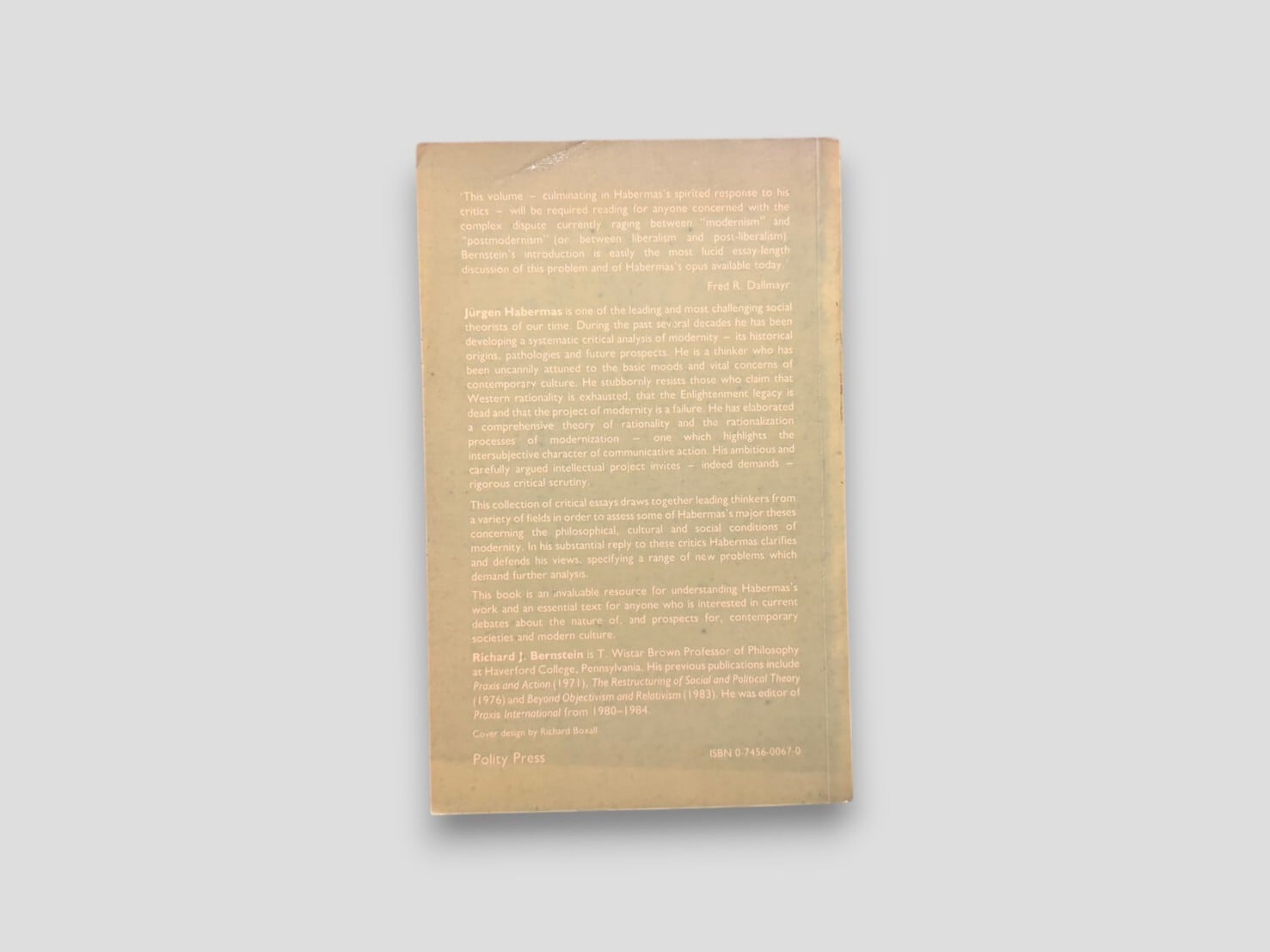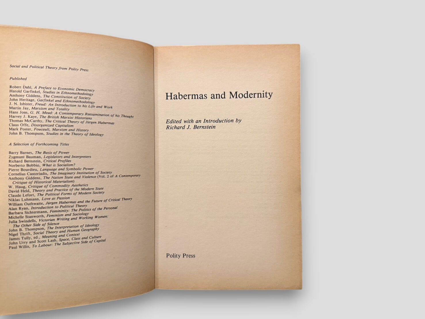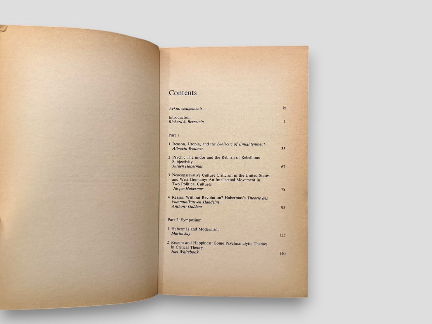 戦後ドイツを代表する思想家ユルゲン・ハーバーマスをめぐる議論が集中的に展開された論集。複数の思想家による批評的エッセイ集として構成される。アンソニー・ギデンズ、マーティン・ジェイ、リチャード・ローティらが、理性、主体、近代性をめぐる問題をそれぞれの立場から検討する。またハーバーマス自身の論文も収録される。近代という概念をどこから考え直すべきかを具体的に示す起点となる一冊。1985年刊行ペーパーバック版。