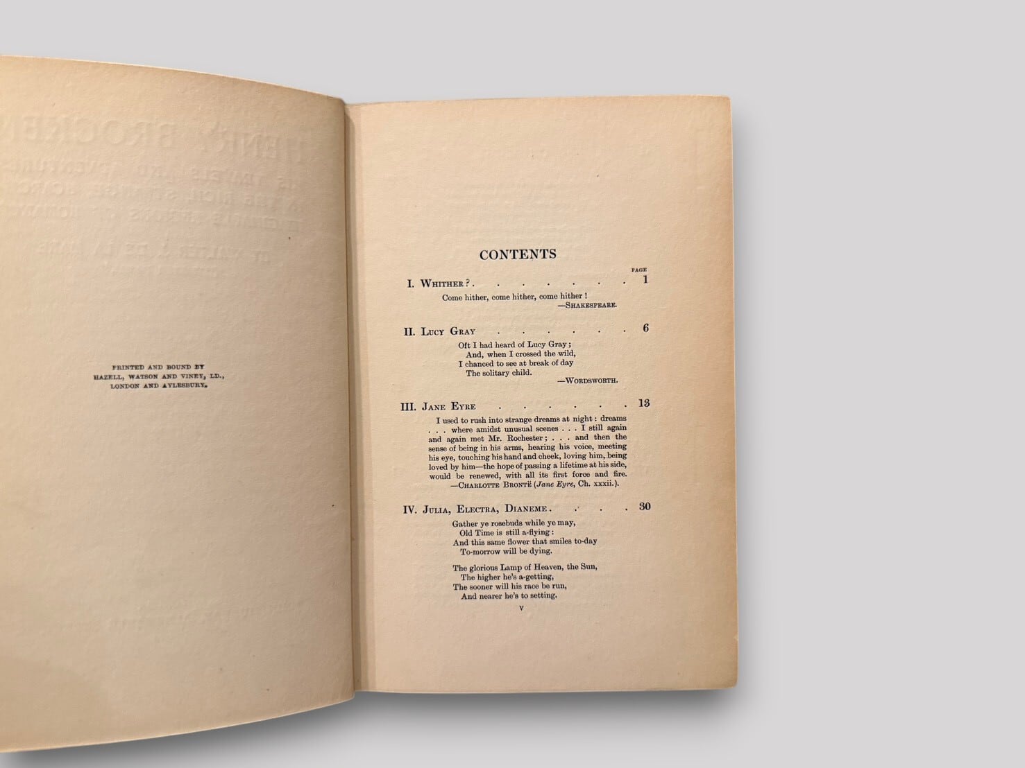 Henry Brocken is a novel by Walter J. de la Mare, first published in 1904. It is structured as a journey narrative through imagined regions and incorporates references to literary figures and texts. This is the first edition.