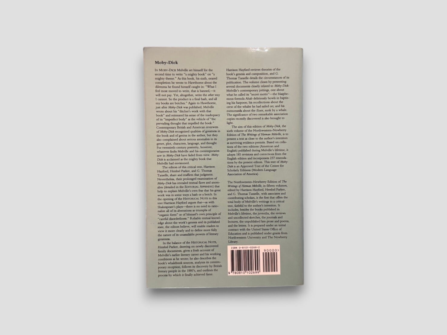 本版はNorthwestern-Newberry Editionとして編まれた批評校訂テキストであり、メルヴィル存命中に刊行されたアメリカ版およびイギリス版を照合し、校訂を施した本文に基づく。『白鯨』を正確に読むための基盤となる一冊。1994年刊行ペーパーバック第2刷。