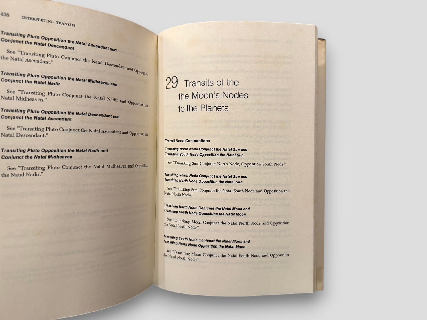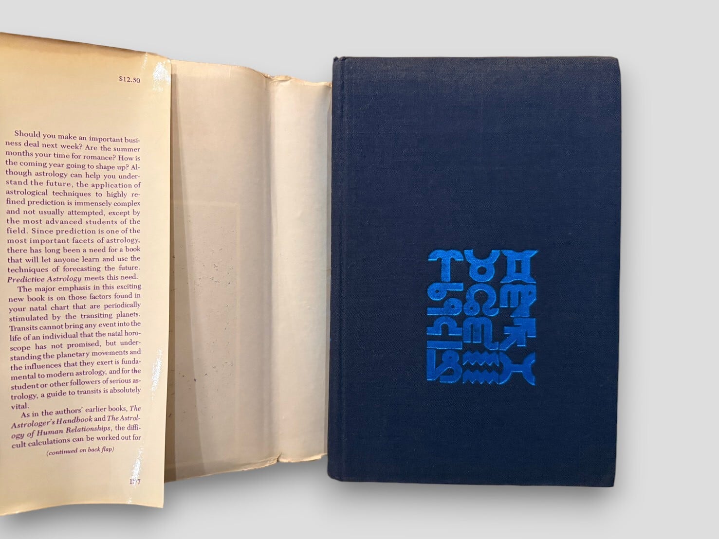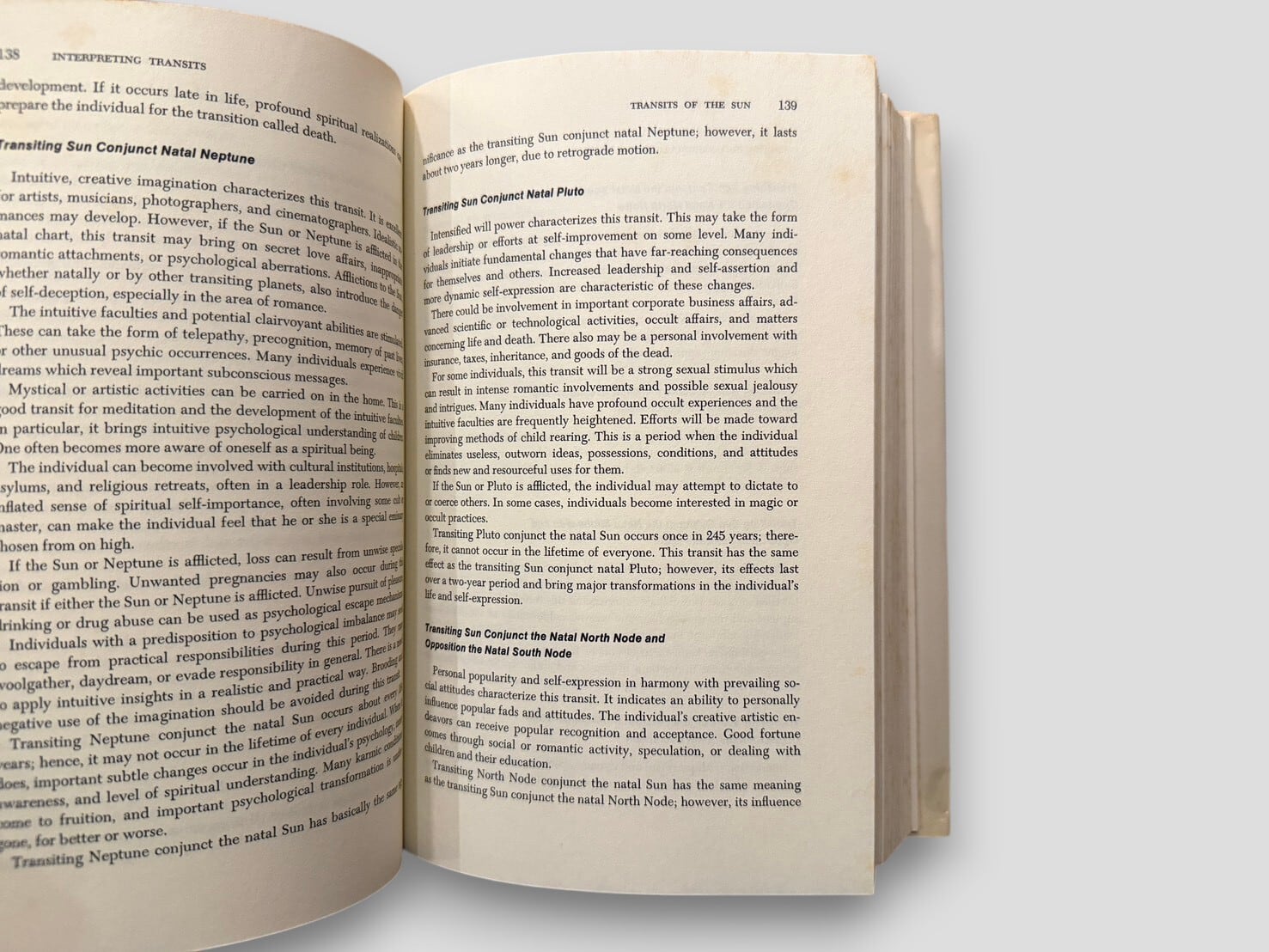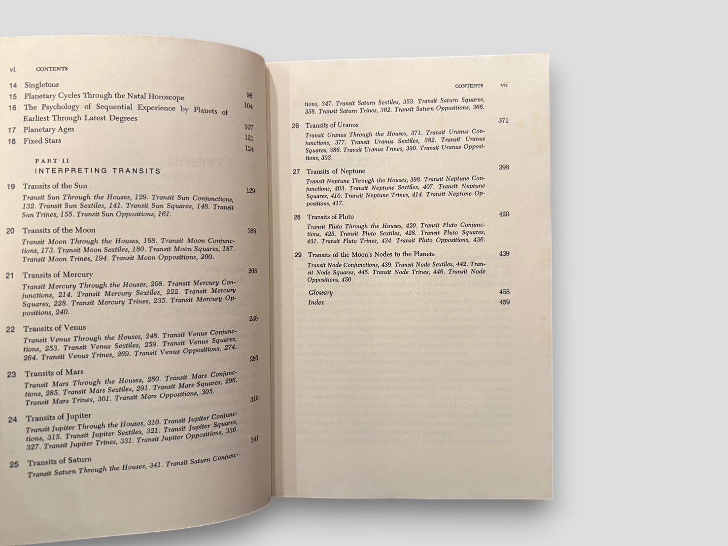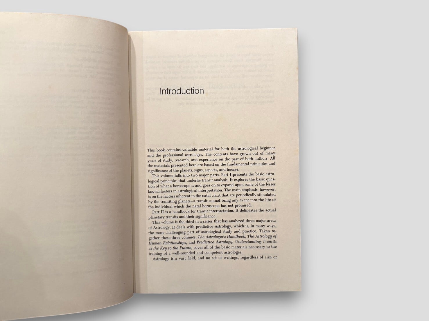 A study of predictive astrology focusing on planetary transits in relation to the natal chart. The book is organized in two parts, presenting basic astrological principles followed by detailed interpretations of transits for the Sun, Moon, and individual planets, arranged by aspect. First edition, published in 1977.