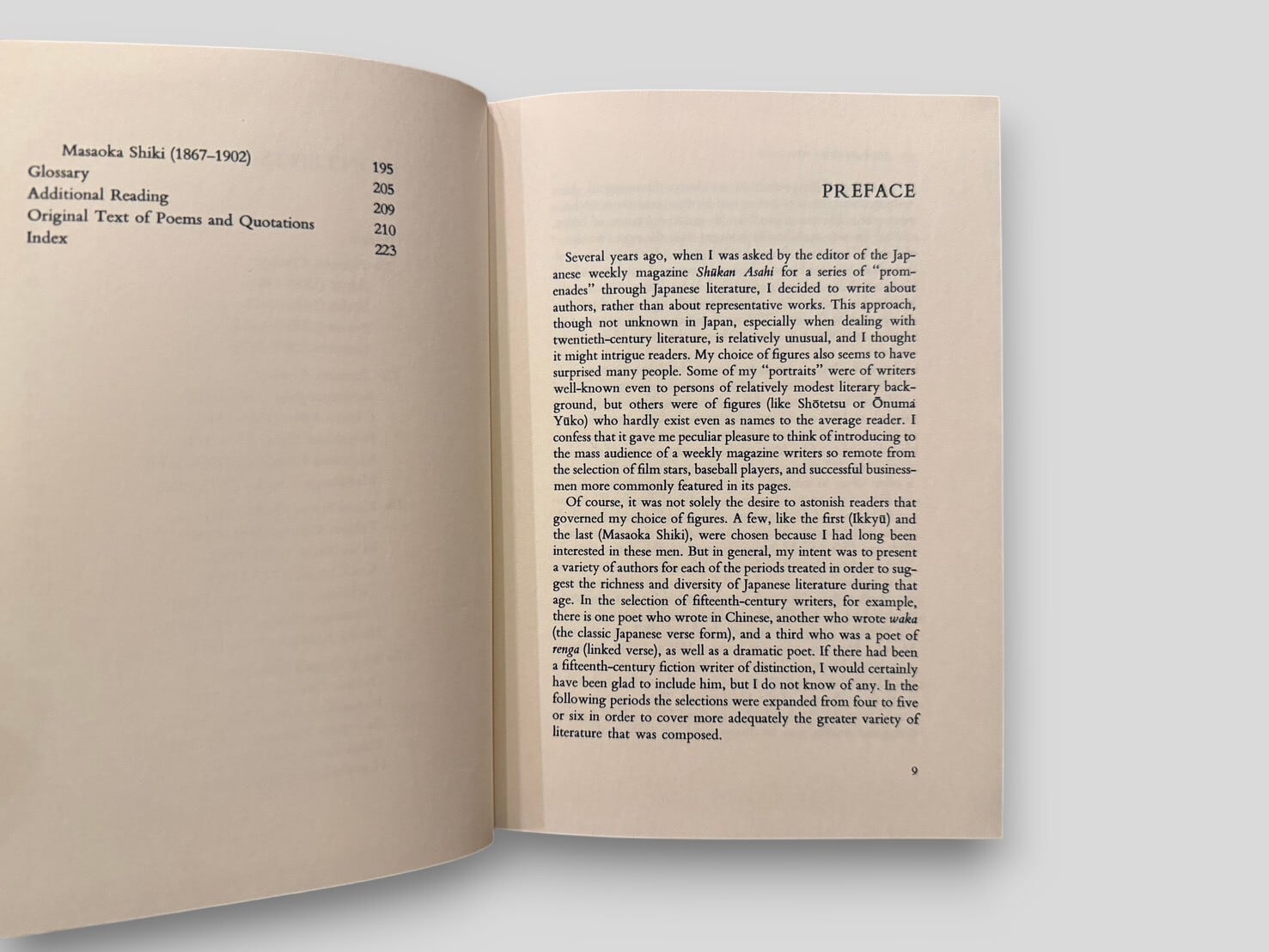 本書は『週刊朝日』に掲載されたエッセイをもとに再構成されたテキストであり、15世紀から明治期に至るまでの21人の作家を時代ごとに配し、それぞれの生涯と作品を手がかりに文学の流れを示す。収録作家には一休や世阿弥などに加え、英語圏での紹介が限られていた人物も含まれる。英語圏における日本文学紹介の中で広く参照されてきた一冊。1978年刊行初版。