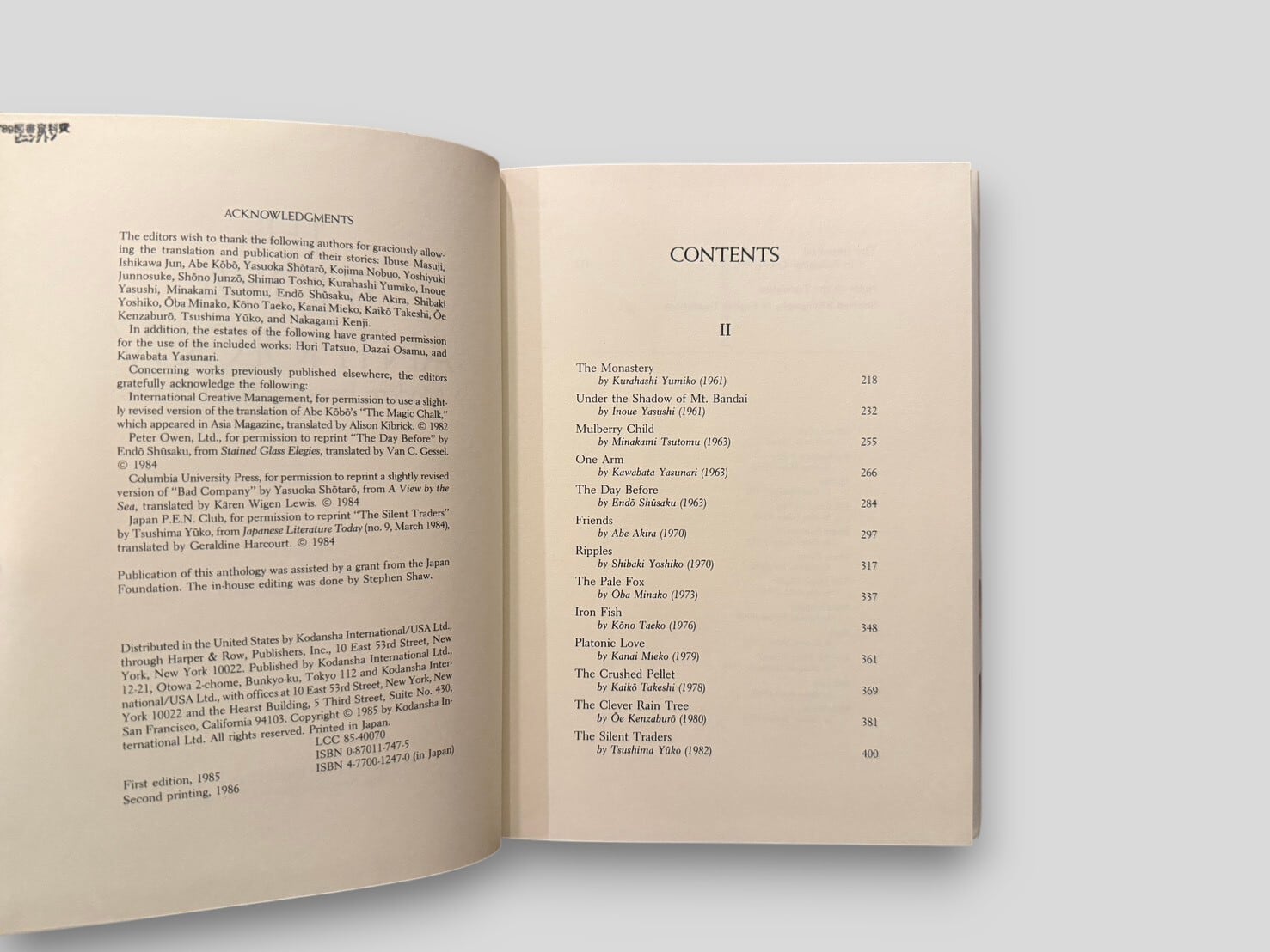 本書は1929年から1984年までの作品を2冊に分けて収録する構成で、井伏鱒二、梶井基次郎、太宰治、石川淳、安部公房、川端康成、遠藤周作、大江健三郎、津島佑子、中上健次などの作家による作品を含む。英語で読まれる昭和文学の広がりを確認するための基礎的なセット。1986年刊行第2刷。