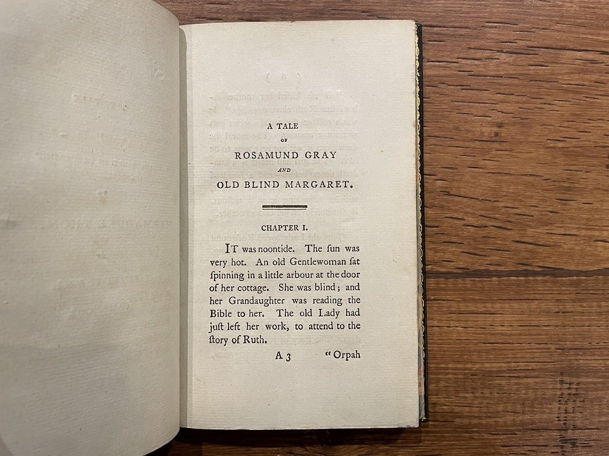 A Tale of Rosamund Gray and Old Blind Margaret. 134pp. (London: Lee and Hurst, 1798) RARE FIRST EDITION. Modern dark blue morocco, gilt dentelles. Spine gilt decorated with 5 raised bands, marbled edges. A very fine, attractive copy.* The London title is a cancel,replacing the Birmingham imprint,of which but two copies are known to exist.*Roff,pp.35-40