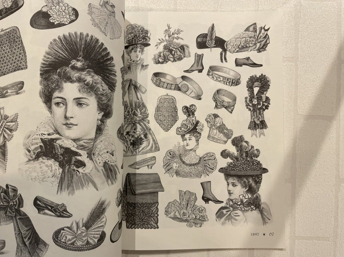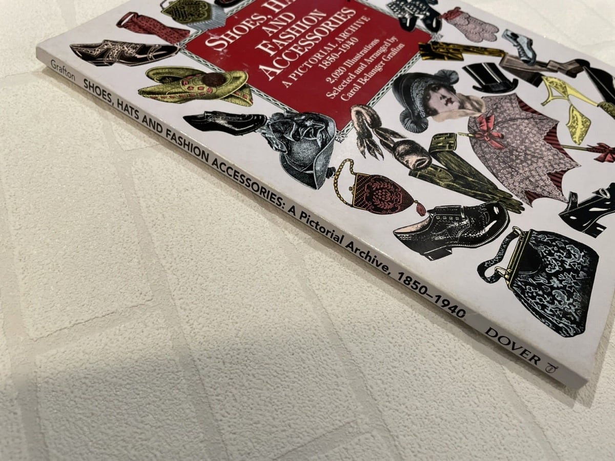 1850年代から1940年代までの珍しい定期刊行物やカタログに掲載されていた靴、帽子、ファッションアクセサリーの2,000以上のイラストを掲載している図案集です。
