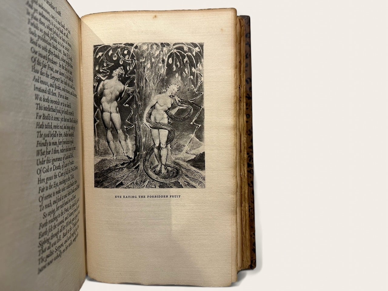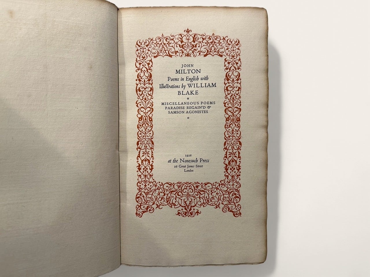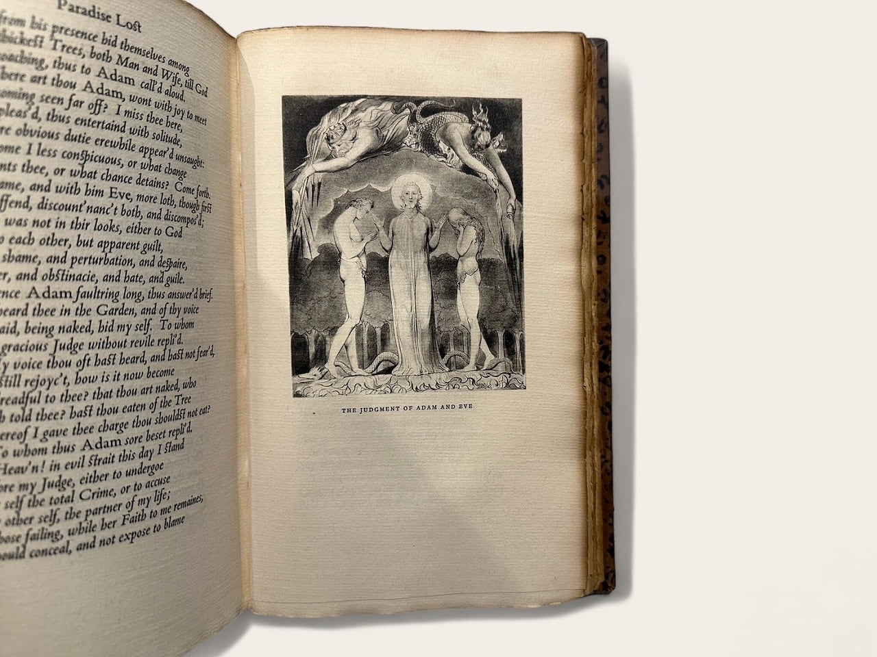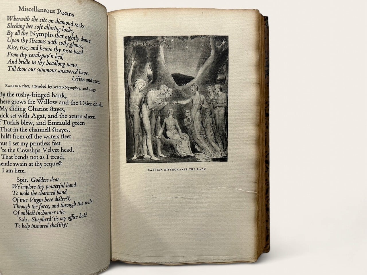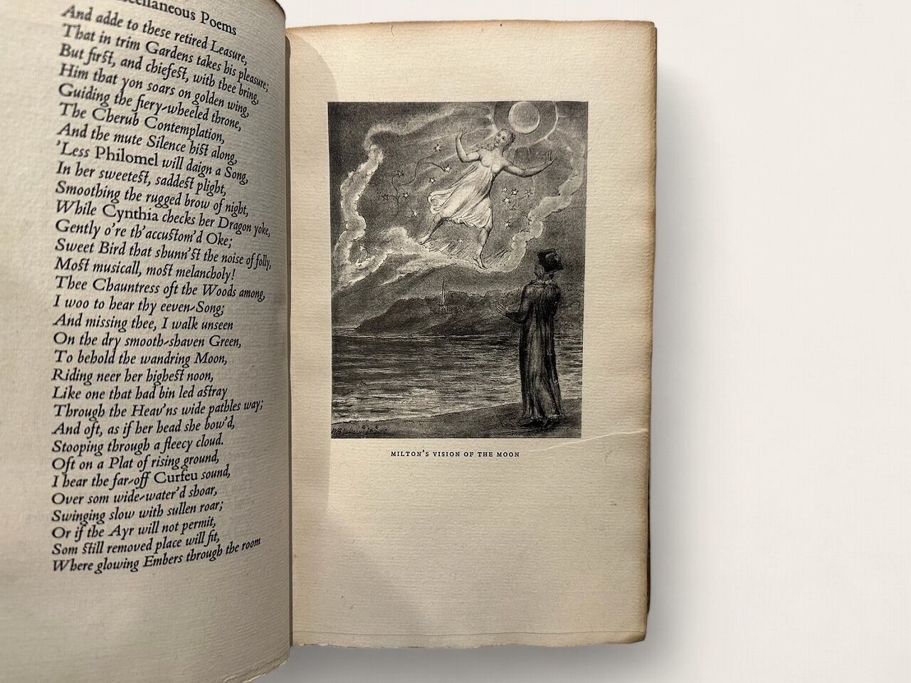イングランドの詩人、ジョン・ミルトン(John Milton:1608-1674)の詩集。代表作『失楽園』の他に詩作品『Miscellaneous Poems』、『Paradise Regained 』『Samson Agonistes』を収録。イギリスの詩人、ウィリアム・ブレイク(William Blake;1757-1827)による美しい挿絵が50プレート以上収録されている。ナンサッチプレス刊行の私家版。限定1450セットのうちのNumber858。貴重なセット。