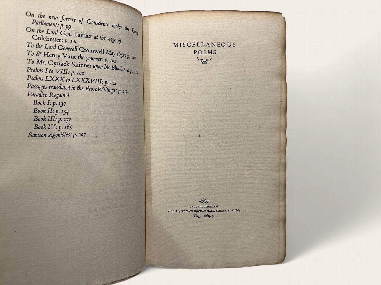 Paradise Lost and Miscellaneous Poems, Paradise Regained and Samson Agonistes. In two volumes. 359, 283pp. This set has beautifully designed boards and is printed on Van Gelder rag paper. Limited to 1450 sets, this is set 858. Spine and edges sunned to brown.