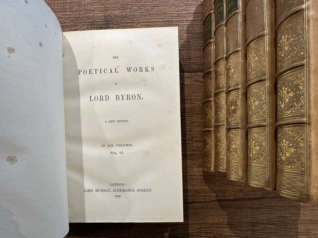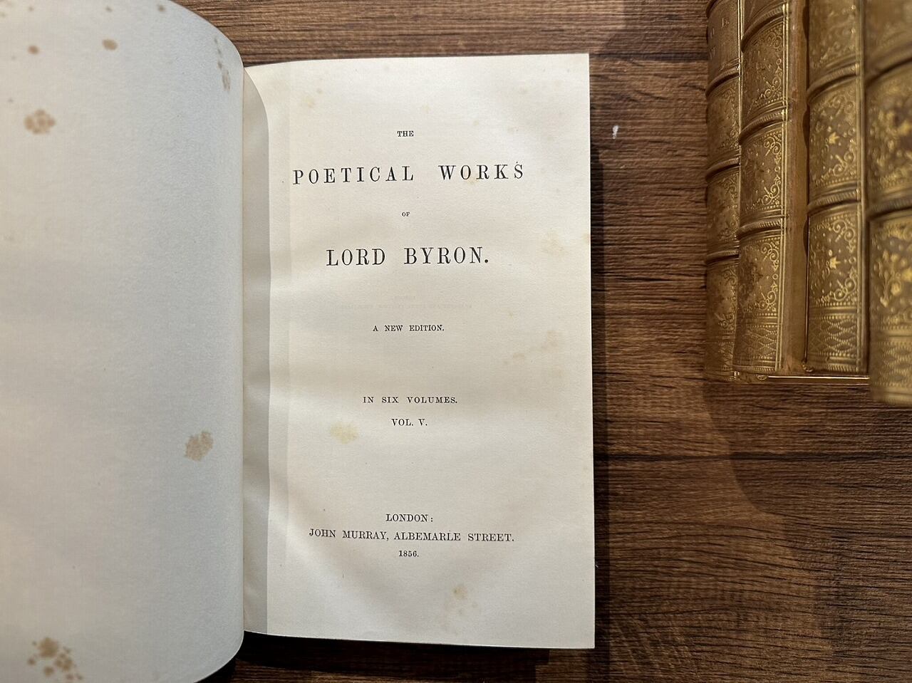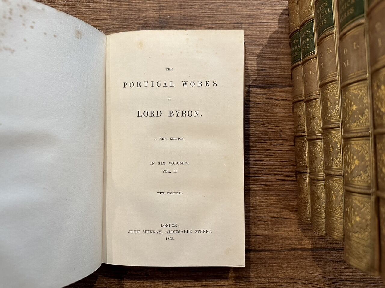 シェイクスピアに次ぐ第二の英国の詩人・第6代バイロン男爵ジョージ・ゴードン・バイロン(George Gordon Byron, 6th Baron Byron, 1788年1月22日 - 1824年4月19日)の詩集。この詩集はバイロンの友人でもあり、ジェーン・オースティンやサー・ウォルター・スコットをはじめ、イングランドで最も有名な作家たちの作品を出版し成功したジョン・マレーによって出版された全集。六巻揃い。
