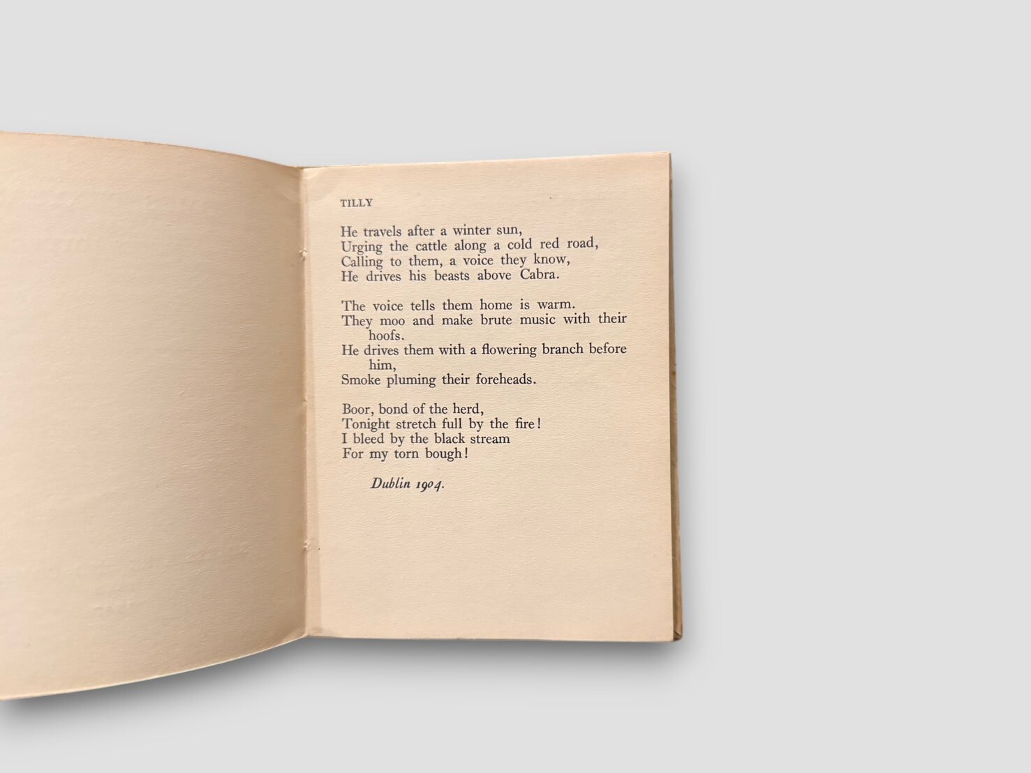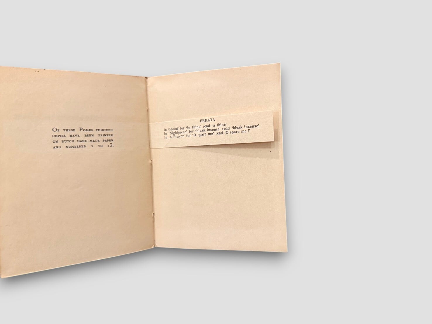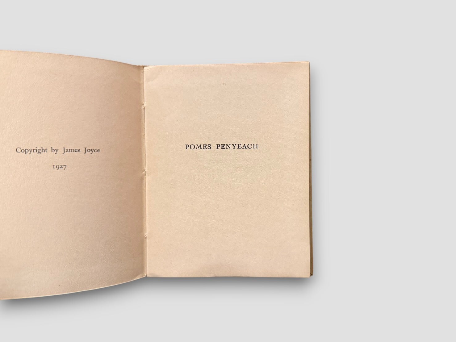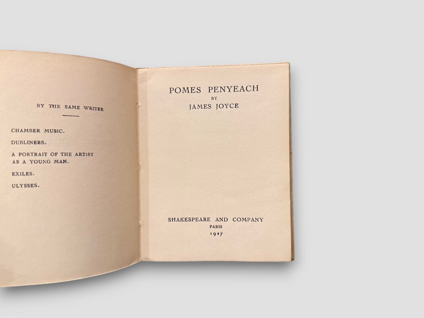 タイトル “Pomes Penyeach” は “Poems Penny Each” をもじったジョイスの言葉遊びで、「一篇一ペニーの詩」という意味を持つ。13個目の詩のタイトルは’Tilly’はアイリッシュ語でオマケの意味をもつ。貴重な初版。