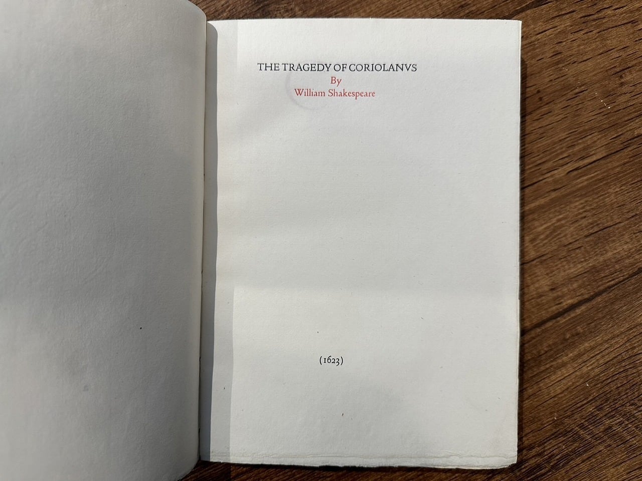This edition of Coriolanus is the 1914 Doves Press edition, which was limited to 200 copies. Associated with the Arts and Crafts movement, William Morris, and the Kelmscott Press, Doves produced many important editions during its seventeen years of operation.