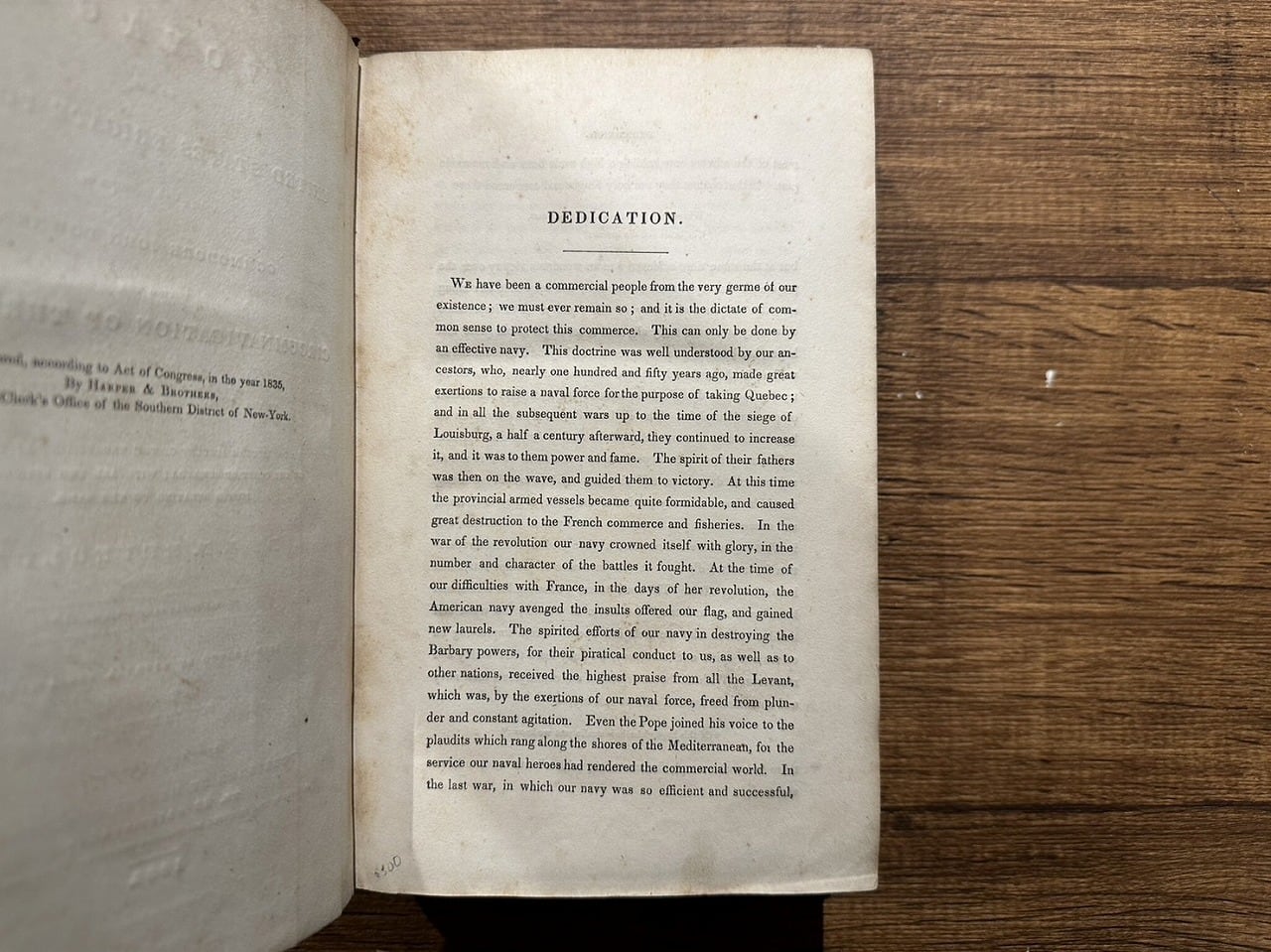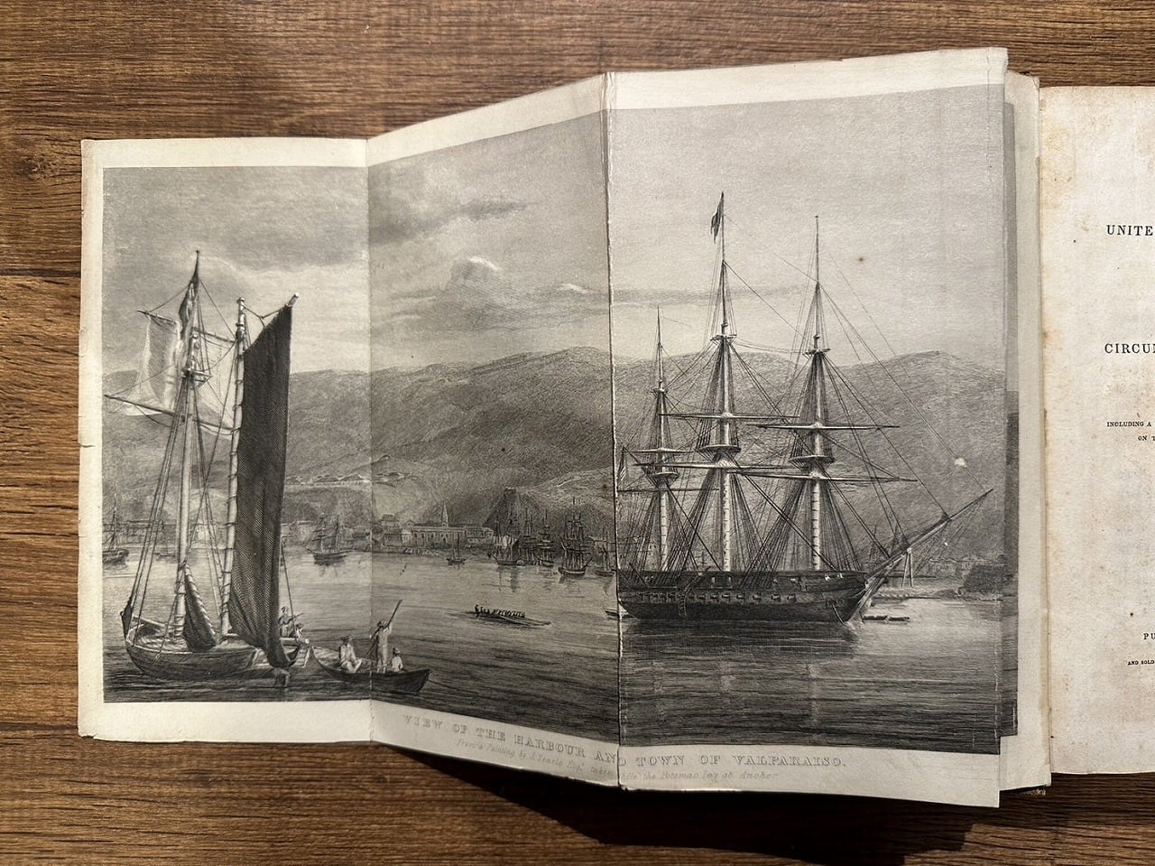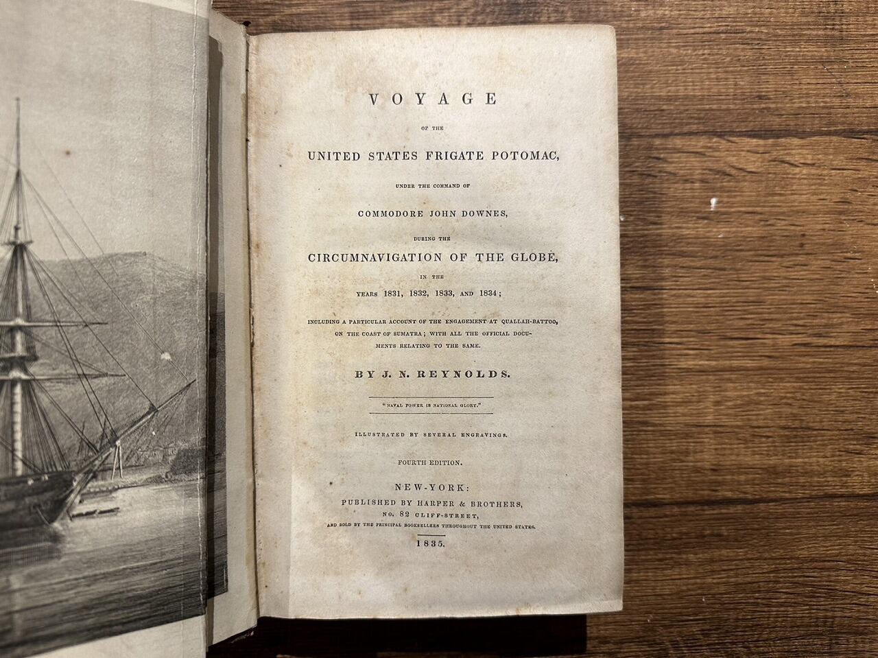 1819 年 8 月にワシントン海軍工廠によって起工され、1822 年 3 月に進水したアメリカ海軍のフリゲート艦、USSポトマック (USS Potomac)の世界舟航記。ポトマックが1834 年 5 月 23 日に世界を一周し、ボストンに戻ったその翌年、米国海軍の士官、ジョン・ダウンズ (海軍士官)Commodore John Downes(1784-1854)が本書を執筆した。1853年のペリー来航 よりも前に来航した可能性がある(生憎この本には日本に寄ったという記述はない)、またはこの船の周航によってペリーが未開地の島に興味を持ち、後に来航したかもしれないとあくまでも想像だが考えると色々と興味深い。当時よほどベストセラーだったのか初版刊行年に重版を何度かしている。こちらも初版刊行年1835年の4TH EDITIONになる。