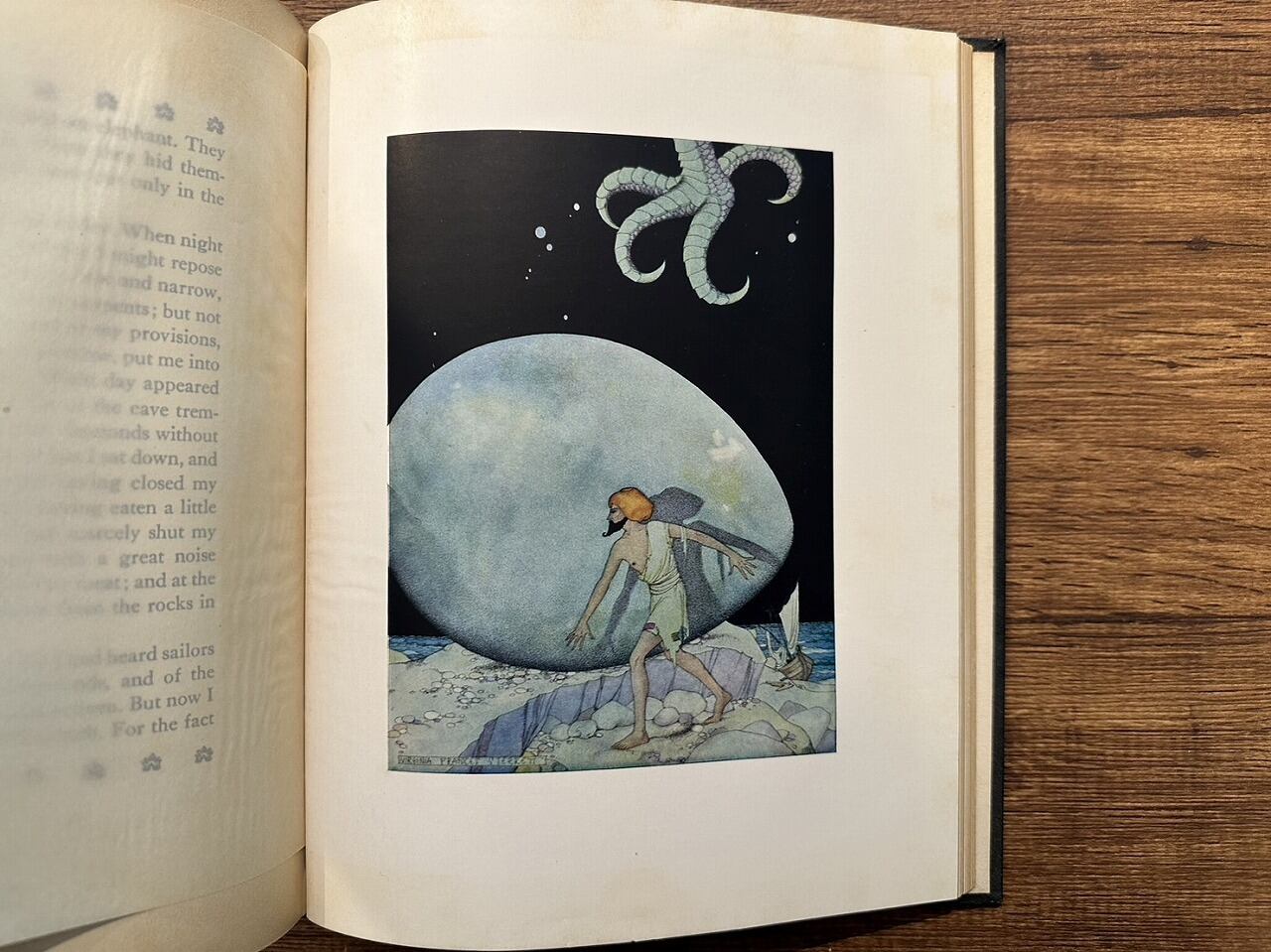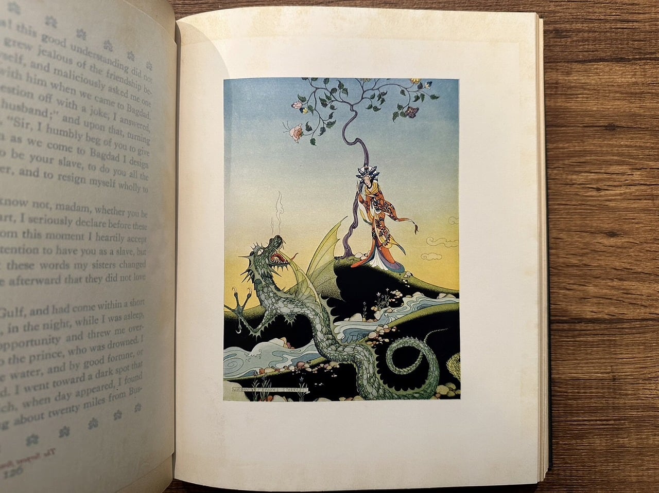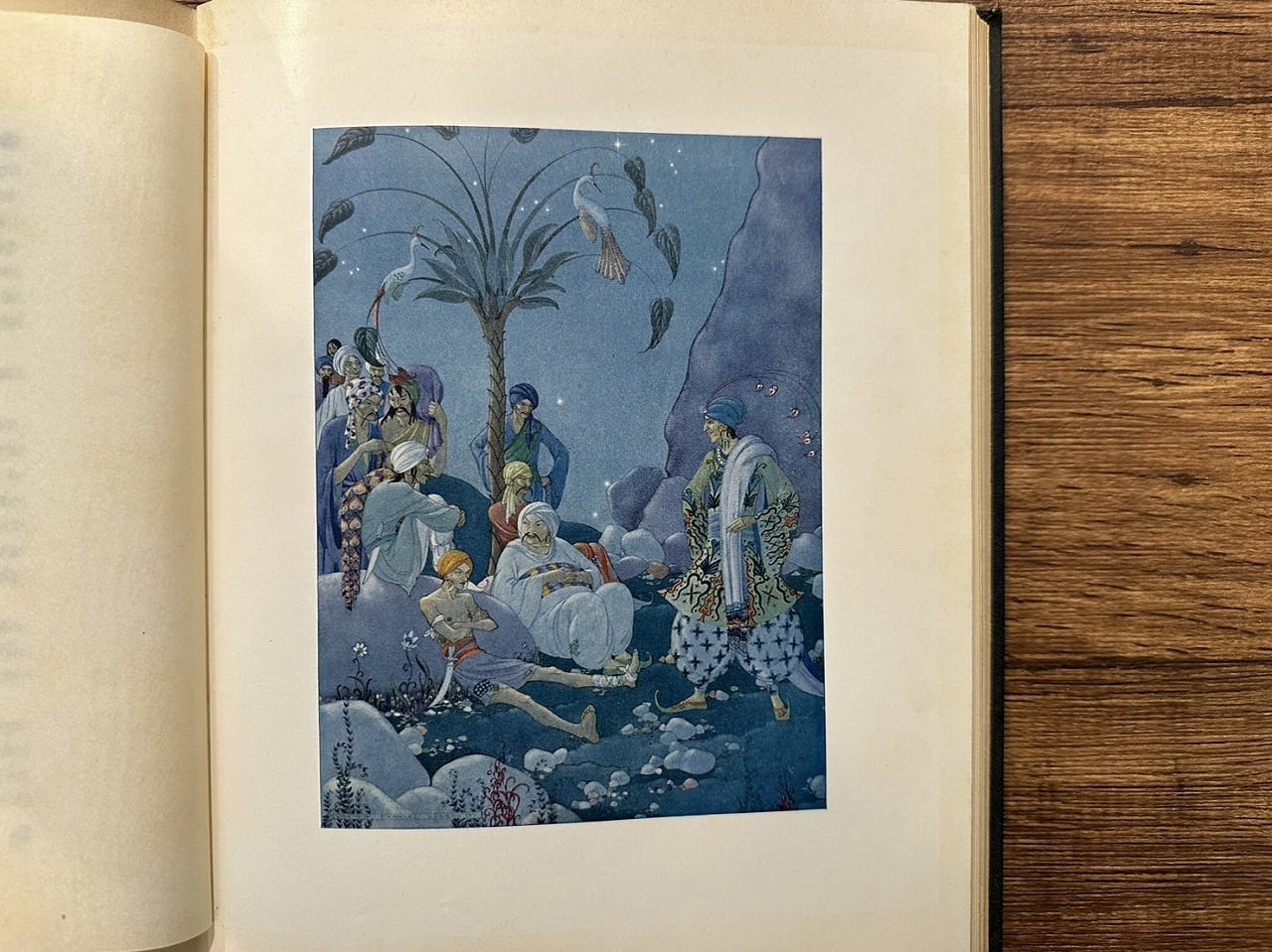 イラストはアメリカのイラストレーター、ヴァージニア・フランシス・ステレット(1900-1931)による挿絵入りの初版である。ステレットは19歳の時にデビュー作となるOld French Fairy Tales (1920) の挿絵を手掛ける。その直後彼女は結核と診断された。この作品はその診断後に手掛けた二作目である。またその後は健康状態が悪化し、31歳の若さでこの世を去る。ステレットの繊細で幻想的なイラストは彼女自身の人生を表現しているようにも見える。また異国の地として彼女があこがれていた東洋のエキゾチックな雰囲気も作品全体を通して感じることができる。このArabian Nightsは彼女のなくなる前の最後の作品であり代表作といわれている。1928年刊行初版。