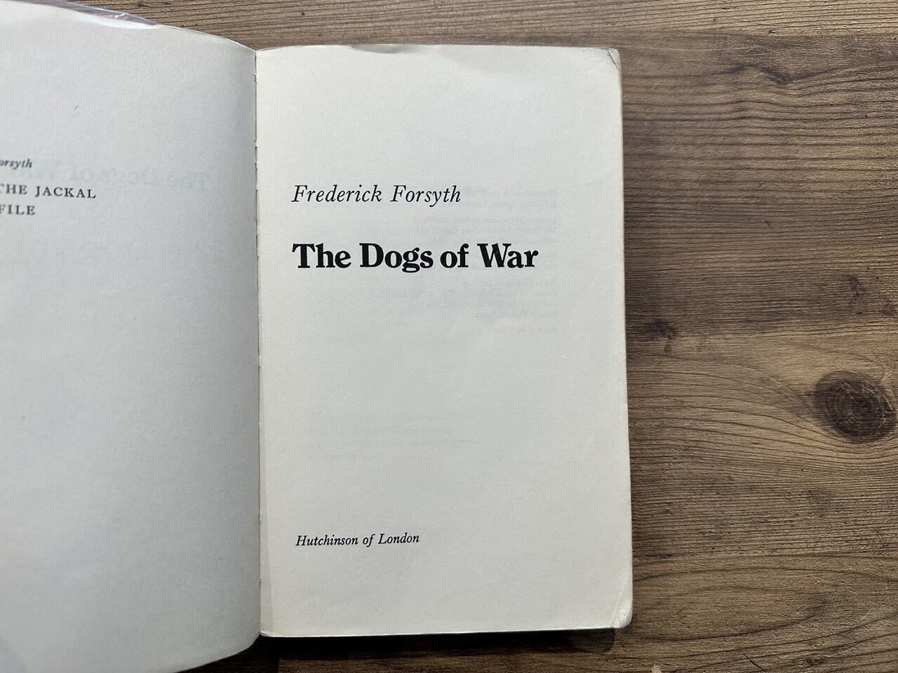 イギリス作家フレデリック・フォーサイス(1938‐)の小説。邦題は『戦争の犬たち』。1974年に作成されたPRROF COPY(出版される前の試し刷りの段階)のためコレクターにはたまらない一冊。スパイ小説や軍を舞台にした作品が多く、世界各国で読まれているが、フレデリック自身も秘密情報部(MI6)の協力者としてスパイ活動を行っていた。