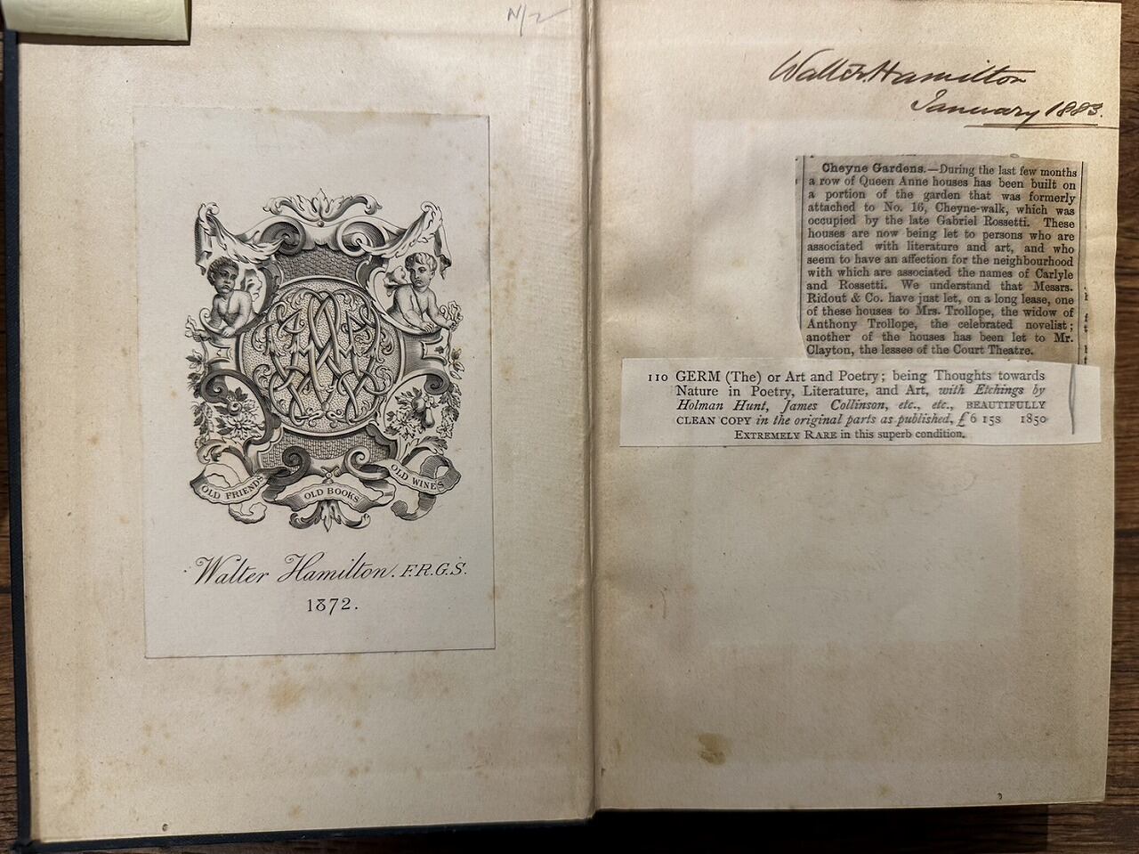 This copy was owned by Walter Hamilton, the author credited with introducing the term "the Aesthetic Movement." With Hamilton's bookplate, his signature (dated January 1883), and several notes throughout in pencil. It also contains two items that have been pasted in: a newspaper clipping and a clipping from a book catalog.