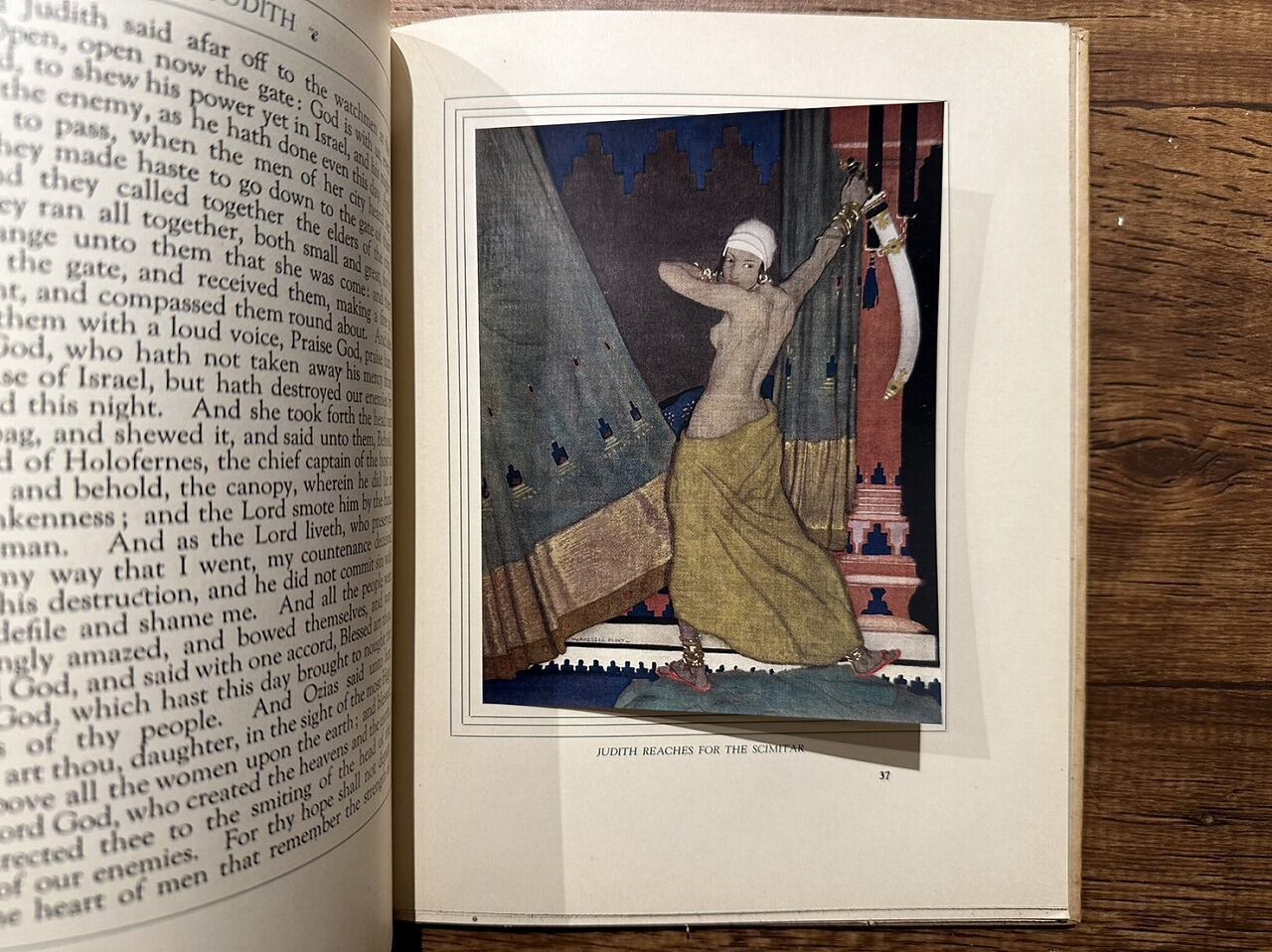 紀元前2世紀ころに書かれた物語『ユディト記』。アルジャーノン・ブラックウッド、アーサー・マッケンとともに近代イギリス怪奇小説の三巨匠と称されたイギリスの小説家、モンタギュウ・ロウズ・ジェイムズ(Montague Rhodes James:1862-1936)による序文とスコットランドの芸術家、イラストレーター、サー・ウィリアム・ラッセル・フリント(William Russell Flint:1880-1969)による挿絵入り。1928年刊行初版。875部限定のうち138部。