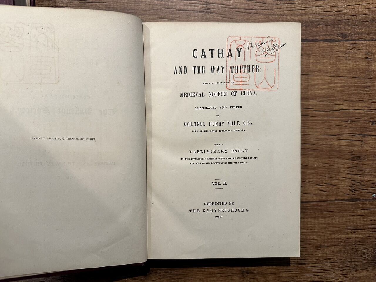 イギリスの旅行家、東洋学者のヘンリー・ユール(Henry Yule 1820-1889)による中世における東西交渉史研究の一大集成。種々の原典を収載して詳細な注釈を付し、諸学者の説を網羅して、東西交通の発達の大勢を叙述した名著。原題にある「カセイ」とは、13世紀後半から西欧において用いられた中国の呼称で、契丹(Khitai)に由来する。第1巻は中世における東西交渉史の概説的論文、第2巻は種々の旅行記や報告書が記載されている。ユールは、本書によりRoyal Geographical Societyの金メダルを授与された。邦訳は『中国および中国への道』。1866年に初版が刊行されており、本書は1898.1899年(明治31.32年)に日本で刊行されたリプリントである。二巻本。