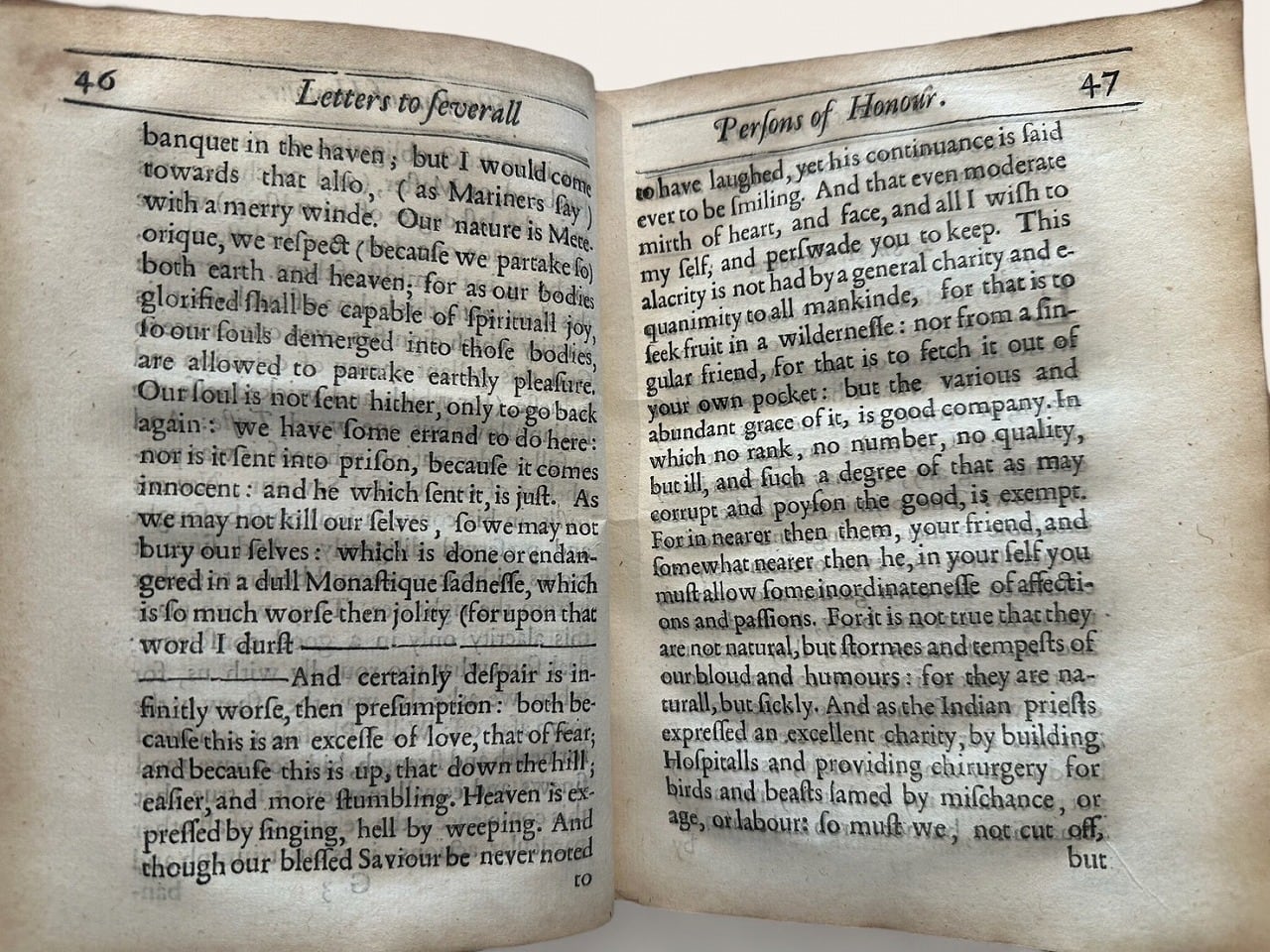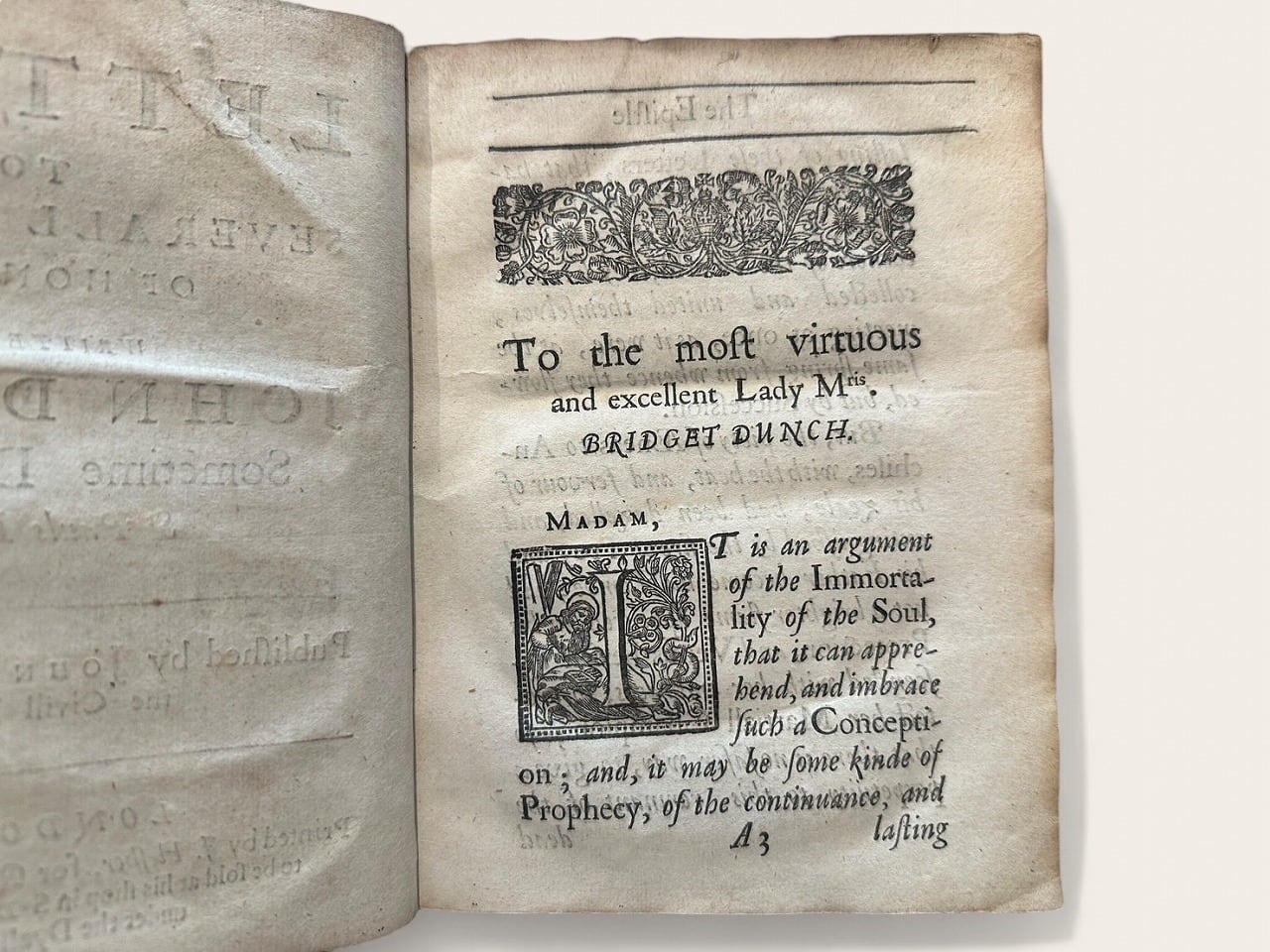 イングランドの詩人で著作家(後半生はイングランド国教会の司祭)のジョン・ダン(John Donne:1572-1631)の書簡集。ジョン・ダンは大胆な機知と複雑な言語を駆使し、恋愛詩、宗教詩、講話を発表した。形而上詩人の先駆者で、T・S・エリオットらに影響を与え、ヘミングウェイ『誰がために鐘は鳴る(For Whom the Bell Tolls)』のタイトルはダンの説教の一節から取られるなど後世の文学者に与えた影響力も大きい人物。本書は彼の死後に出版された書簡集で主作品である詩や説教とは別の彼の人間像を表す非常に貴重な文献。1651年刊行、非常に貴重な初版。