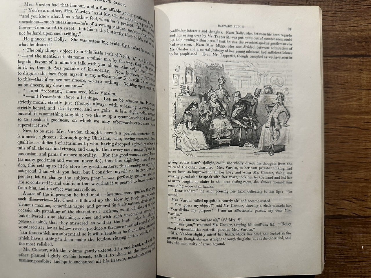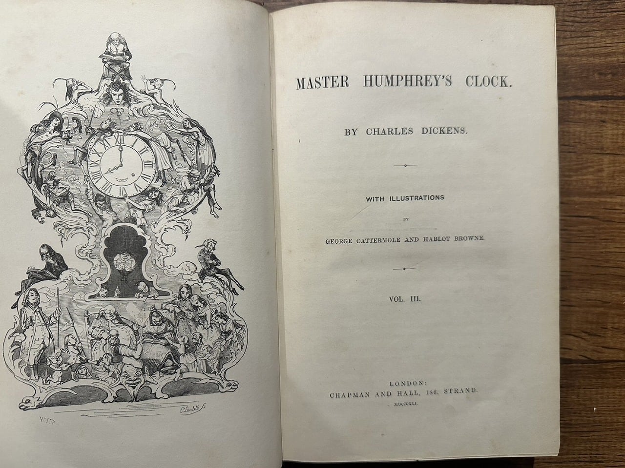 ヴィクトリア朝時代を代表するイギリスの小説家,チャールズ・ジョン・ハファム・ディケンズ(Charles John Huffam Dickens:1812-1870)の短編小説。ロンドンに住む孤独な男、マスターハンフリーが自分自身と彼の小さな友人コミュニティ(ピクウィックも含まれる)について語る物語集となっている。この物語が刊行されてから関連小説『The Old Curiosity Shop』(骨董屋:1840-41)と『Barnaby Rudge』(バーナビー・ラッジ:1841)が刊行されている。本書は1840-41年に刊行された初版で揃3冊を2冊に合本したもの。挿絵多数収録。