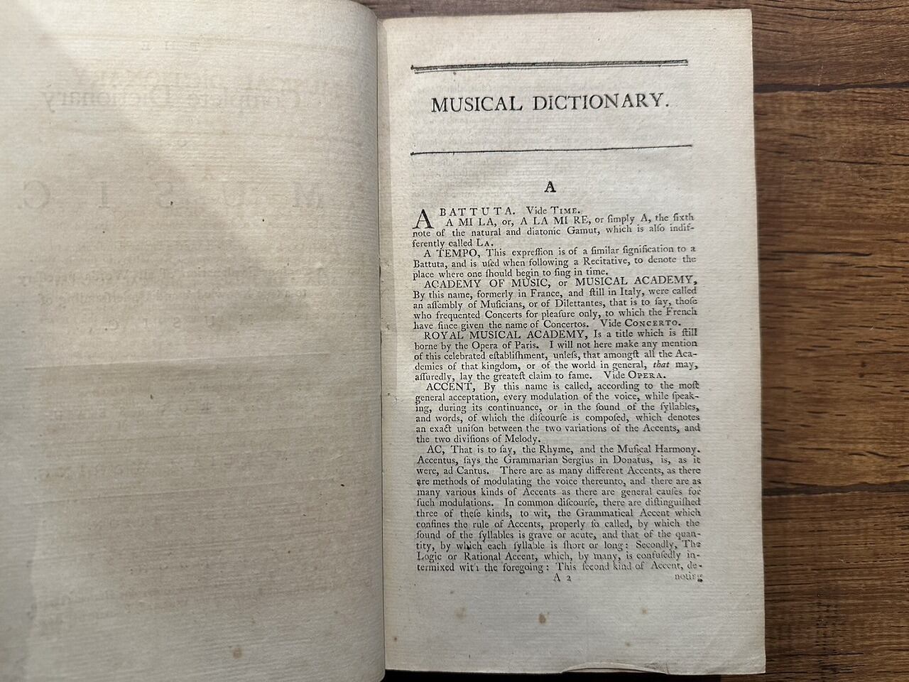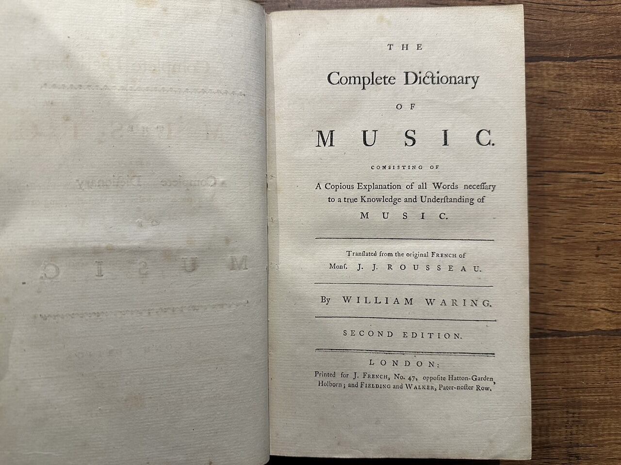 フランス語圏ジュネーヴ共和国に生まれ、主にフランスで活躍した哲学者、ジャン=ジャック・ルソー(Jean-Jacques Rousseau:1712-1778)による音楽辞典。W.Warningによる英訳本。音楽の真の知識と理解に必要なすべての単語と解説が記してある。1779年刊行。第2版。