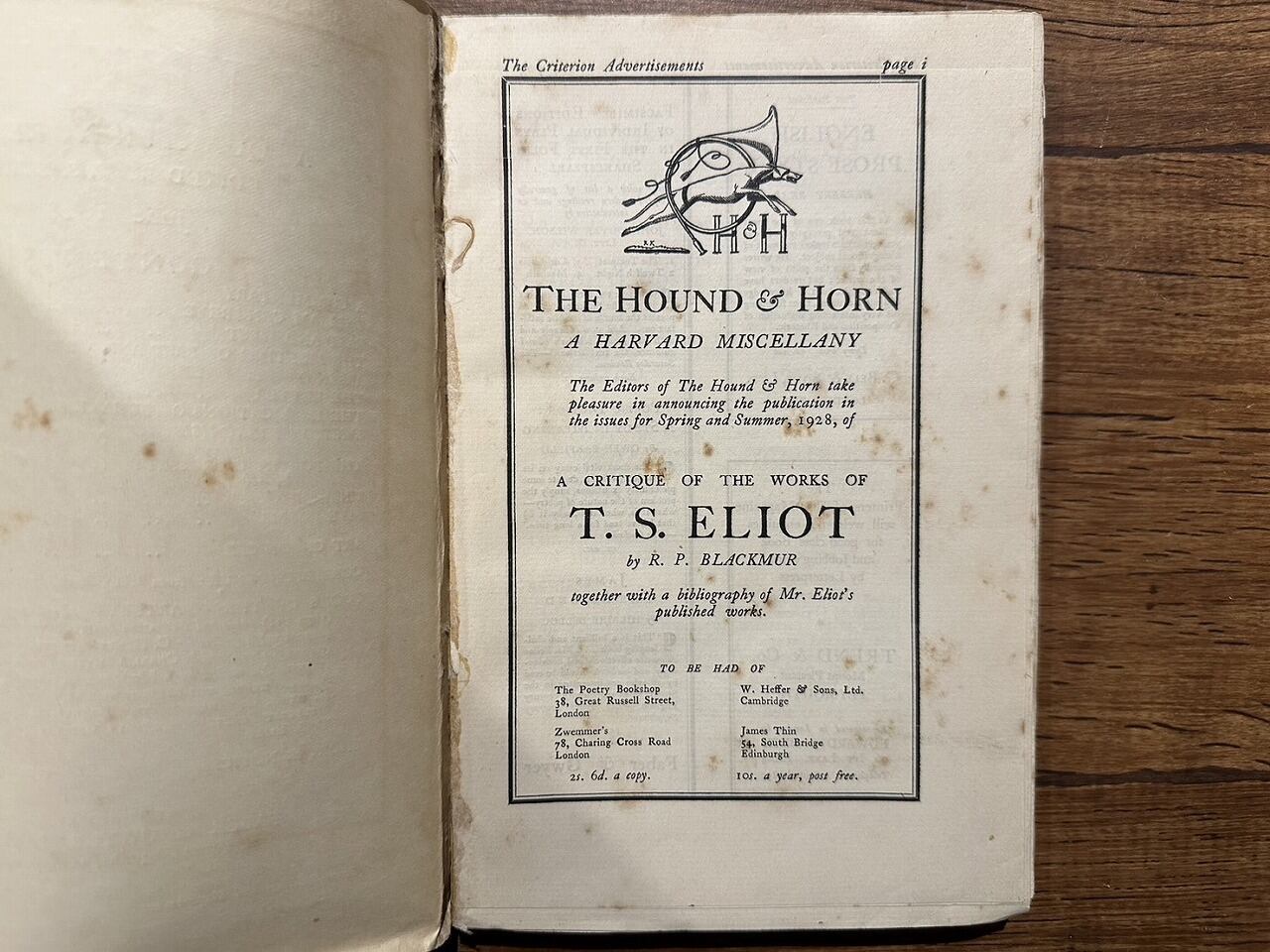 アメリカ合衆国出身のイギリスの詩人・文芸批評家、T・S・エリオット(Thomas Stearns Eliot;1888-1965)が編集した文芸誌『クライテリオン』創刊号から終刊までの完揃いセット。全18巻。揃71冊。