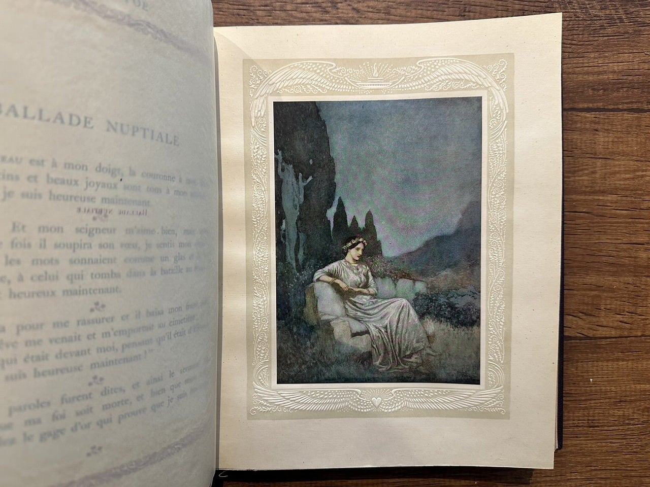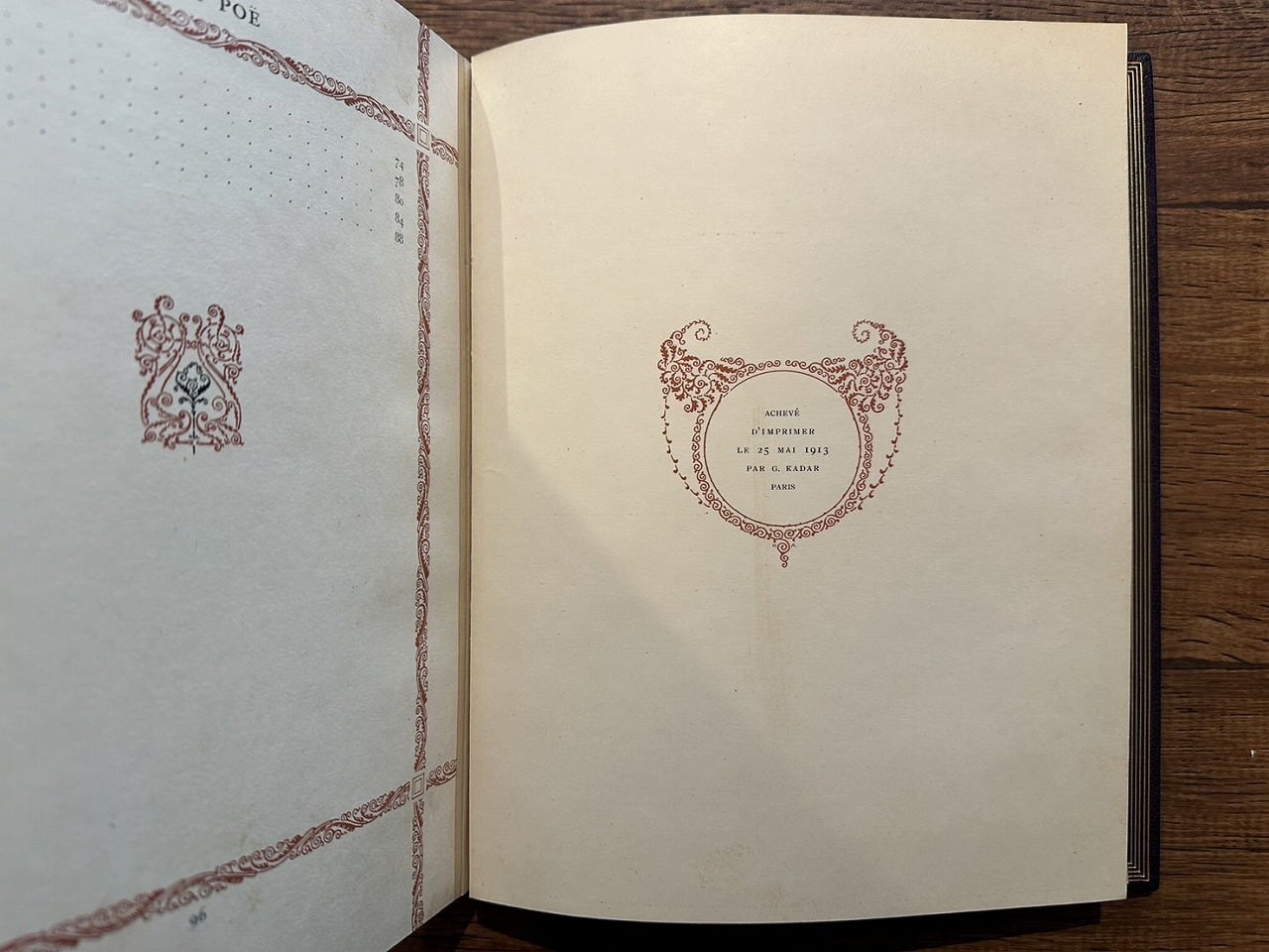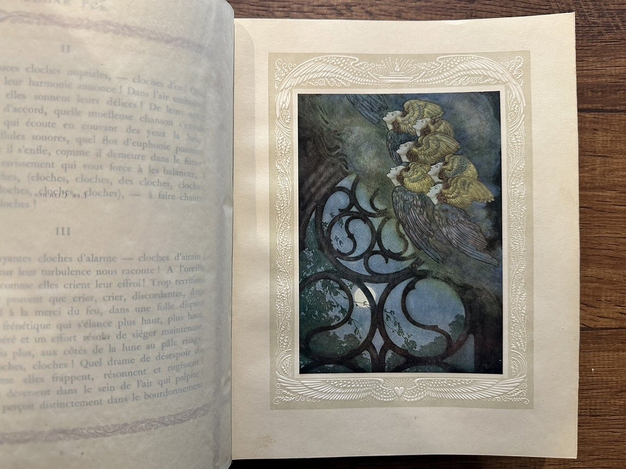アメリカ合衆国の小説家のエドガー・アラン・ポー(Edgar Allan Poe:1809-1849)が1849年に発表した詩、「鐘」(The Bells)を仏訳したもので、挿絵はイギリスの挿絵画家、エドマンド・デュラック(Edmund Dulac:1882-1953)が手掛けている。東洋的な画法を学んだデュラックの妖艶な挿絵と装丁家のL. Lemardeleyが施したエキゾチックな特別豪華装丁が絶妙にマッチした、極めて美しい大変貴重な1冊。1913年刊行。限定400部。