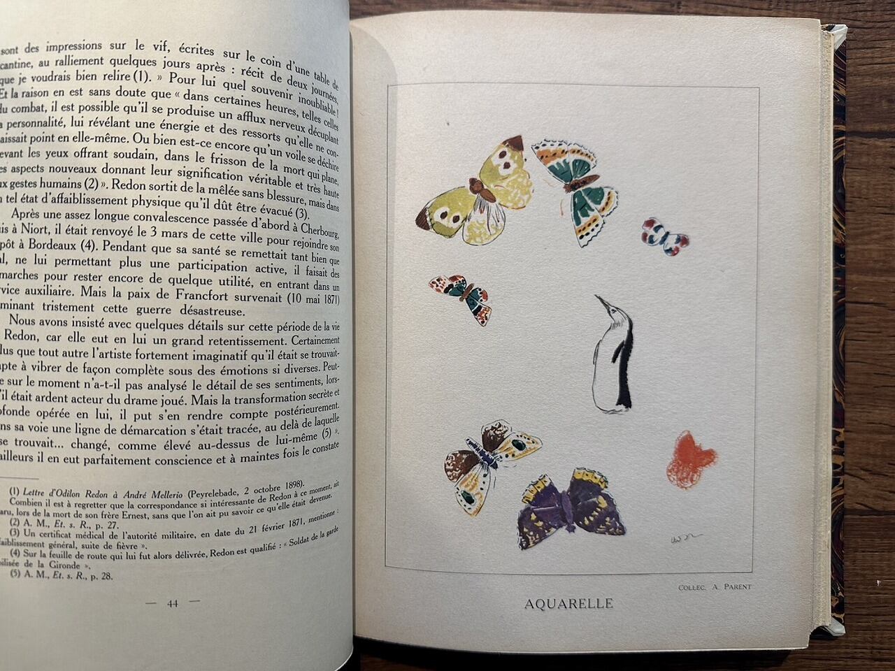 19世紀後期から20世紀初期にかけて活動したフランスの画家、オディロン・ルドン(Odilon Redon:1840-1916)の伝記。光の効果を追求し、都会生活のひとこまやフランスのありふれた風景を主な画題とした印象派の画家たちに対し、ルドンはもっぱら幻想の世界を描き続けた独自の道を歩んだ孤高の画家である。ルドンの作品群には断頭や目玉など、モノクロの版画であることもあって絶望感を感じさせるものが多くあるが、人間の顔を具えた植物のようなものや動物のような顔で笑う蜘蛛など、どこか愛嬌のある作品も描いた。本書はルドンの友人である美術評論家、アンドレ・メレリオによる図版が多数収録されているルドン伝になる。モロッコ革の美しい装丁。1923年刊行。