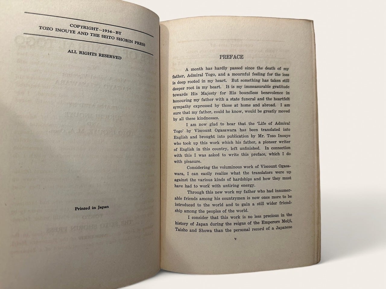 日本の海軍軍人、東郷 平八郎(1848-1934)の伝記。東郷は指揮を執った日本海海戦での完勝により国内外で英雄視され、「陸の大山、海の東郷」「東洋のネルソン」と呼ばれた。著者は同じく日本の海軍軍人である小笠原 長生(1867-1958)。見開きに東郷のポートレート、ページ内写真多数収録。