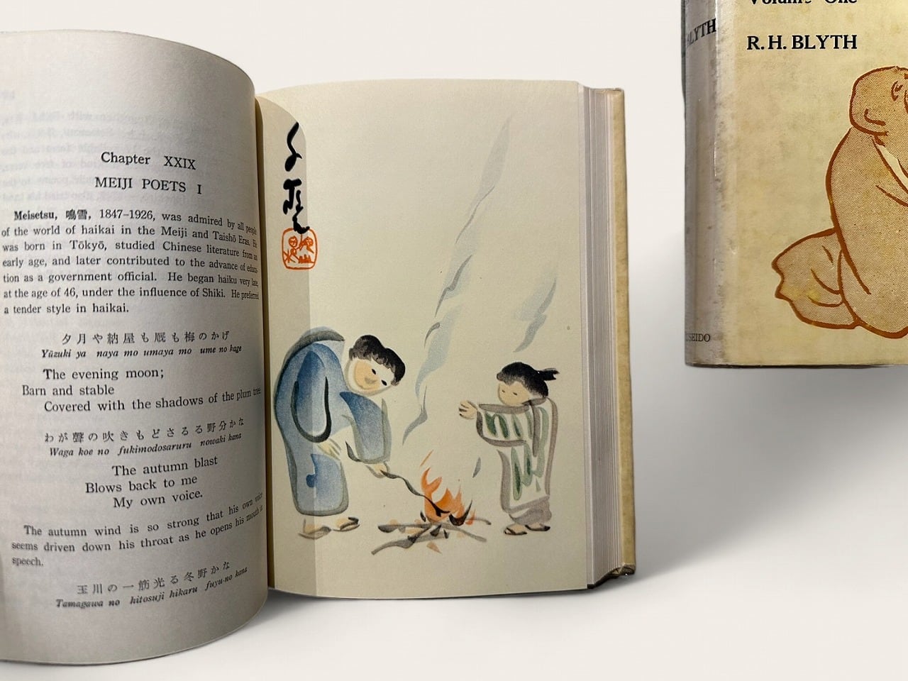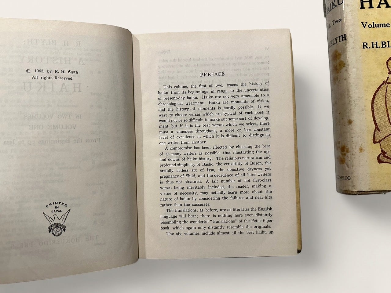 First edition, original beige cloth, title in black on spine, 俳句 in black on front cover, with illustrations including some coloured, with original illustrated jacket, vol. 1 From the Beginnings up to Issa vol. 2 From Issa up to the Present, Complete set in two volumes, some spotting on spine on jacket, else still a GOOD SET