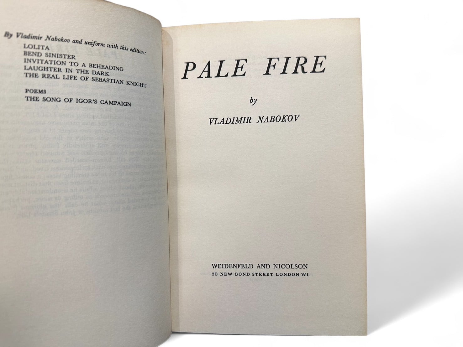 帝政ロシアで生まれ、ヨーロッパとアメリカで活動した作家、ウラジーミル・ナボコフによる渡米後の英語作品。ジョン・シェイドという架空の詩人が書いた『青白い炎』という架空の詩から始まり、彼の友人である文学研究家チャールズ・キンボートによるその詩に対する註釈が小説として展開される。英国初版第3刷。