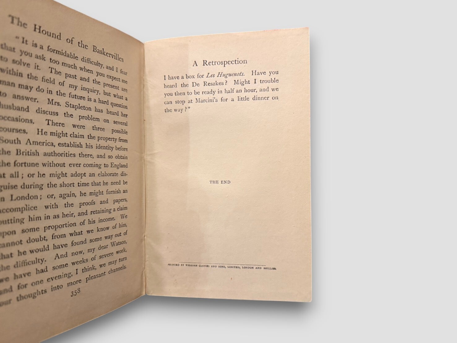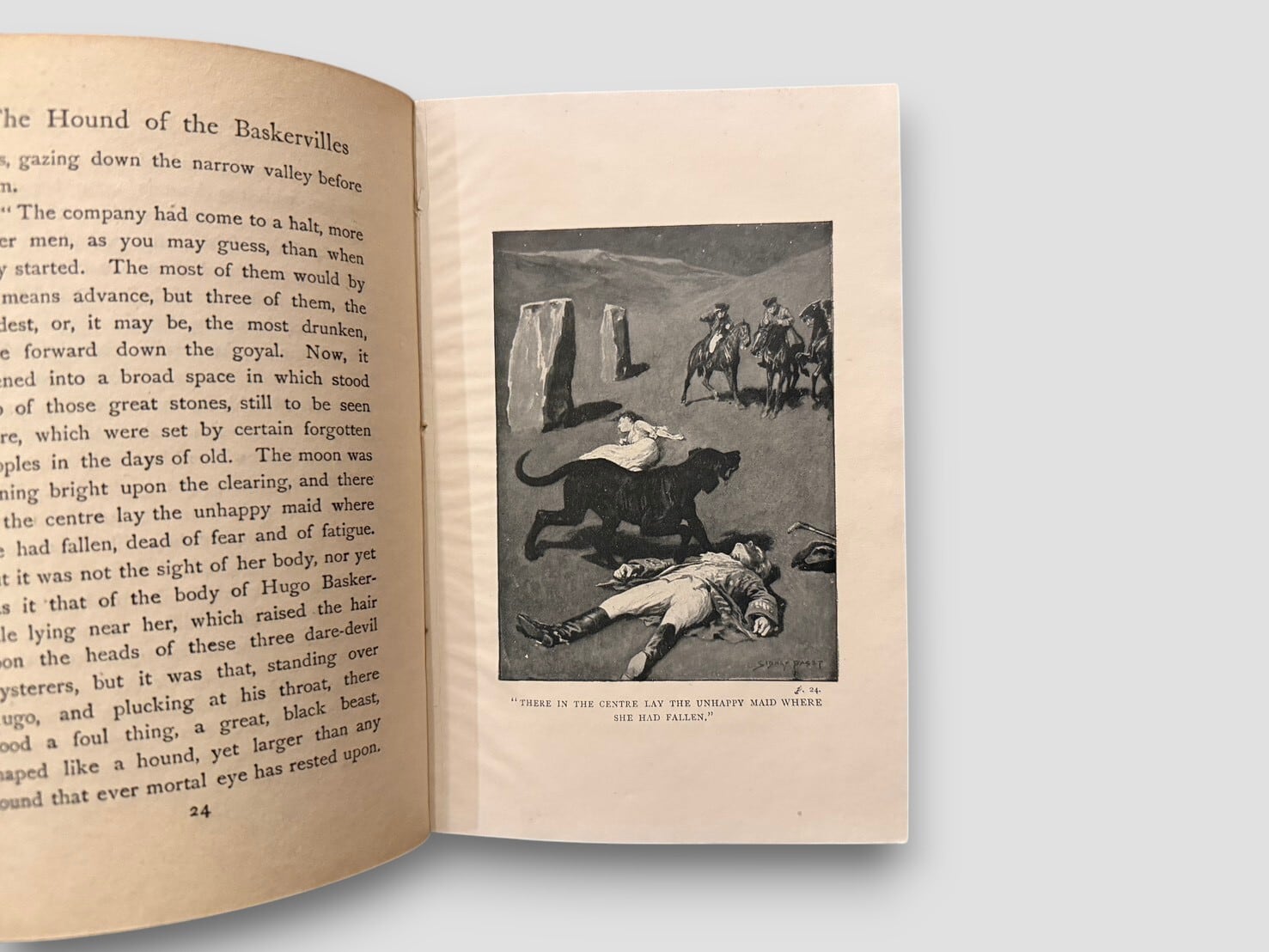 First edition, first printing, original red cloth, gilt title and design on spine, gilt title and design and illustration of hound in black on front cover, frontispiece and 15 illustratios by Sidney Paget, third line of page13, printing you, is FIRST PRINTING POINT, slightly rubbed at upper part of back cover, slightly small blured in red ink at upper part of side edge, else still a NEAR FINE COPY