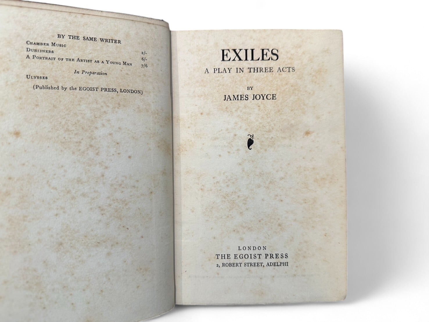 アイルランド出身の小説家、詩人ジェイムズ・ジョイスによる戯曲。邦訳は『追放者たち』。この作品は「死者たち」を原型として1914年の第一次世界大戦勃発の直後から書きはじめられ、1918年に初版が刊行された。本書は1921年に刊行された第2版。ジョイスにとって唯一の戯曲作品であり、貴重な一冊。