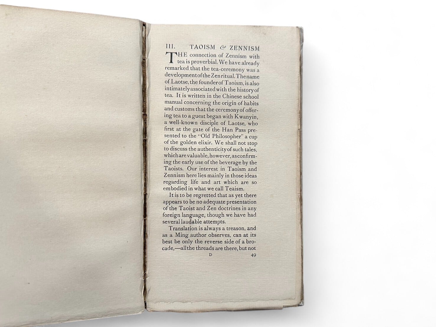 日本の思想家、岡倉 覚三(1863-1913)による名著『茶の本』。日本の茶道を欧米に紹介する目的で、米国ボストン美術館で中国・日本美術部長を務めていた天心が、ニューヨークの出版社から1906年に刊行した。茶道を仏教、禅、道教、華道との関わりから広く捉え、日本人の美意識や文化を解説している。本書は1919年に英国で刊行された英国版初版。
