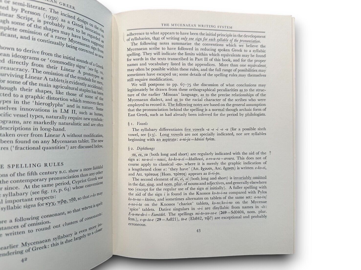 イギリスの建築家、古代文化研究家のマイケル・ヴェントリス(1922-1956)とイギリスの言語学者、ジョン・チャドウィック(1920-1998)二人によって解読されたミケーネ・ギリシャ語(線文字B)についての文献。第2版。図版多数収録。