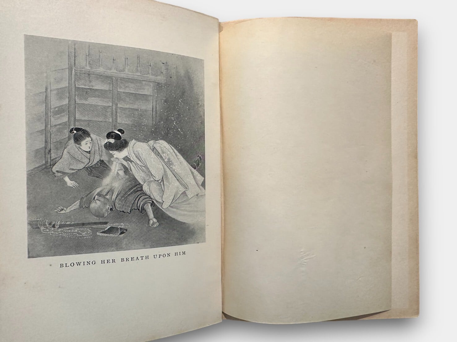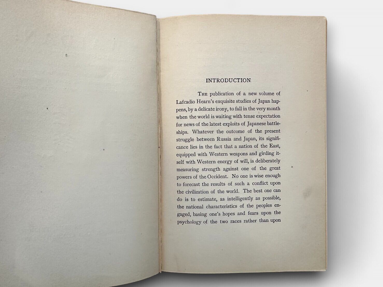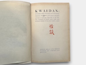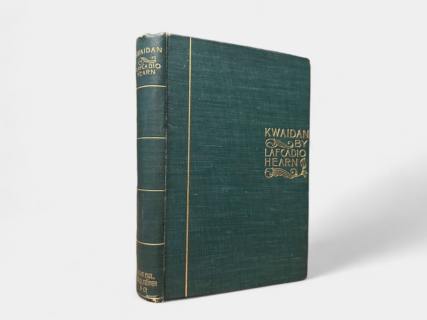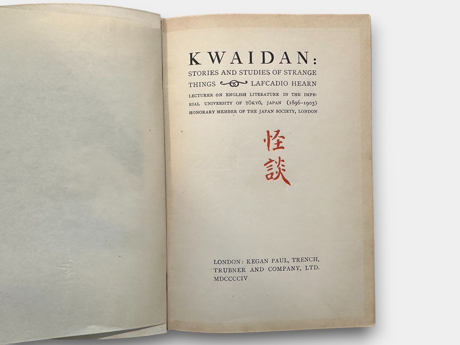 アイルランド系・ギリシャ生まれの明治時代の小説家、ラフカディオ・ハーンによる怪奇文学作品集『怪談』。八雲の妻である節子から聞いた日本各地に伝わる伝説、幽霊話などを再話し、独自の解釈を加えて情緒豊かな文学作品として世に出した。本書は珍しい1904年英国版初版。(先に出版したアメリカと同年に出版している)
