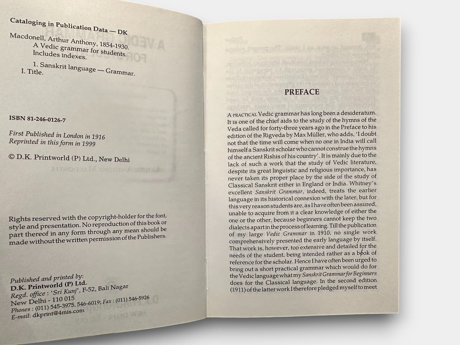 イギリスの東洋学者、アーサー・アンソニー・マクドネル(1854-1930)著。バラモン教の聖典『ヴェーダ』において用いられた典礼言語、ヴェーダ語文法の入門編。