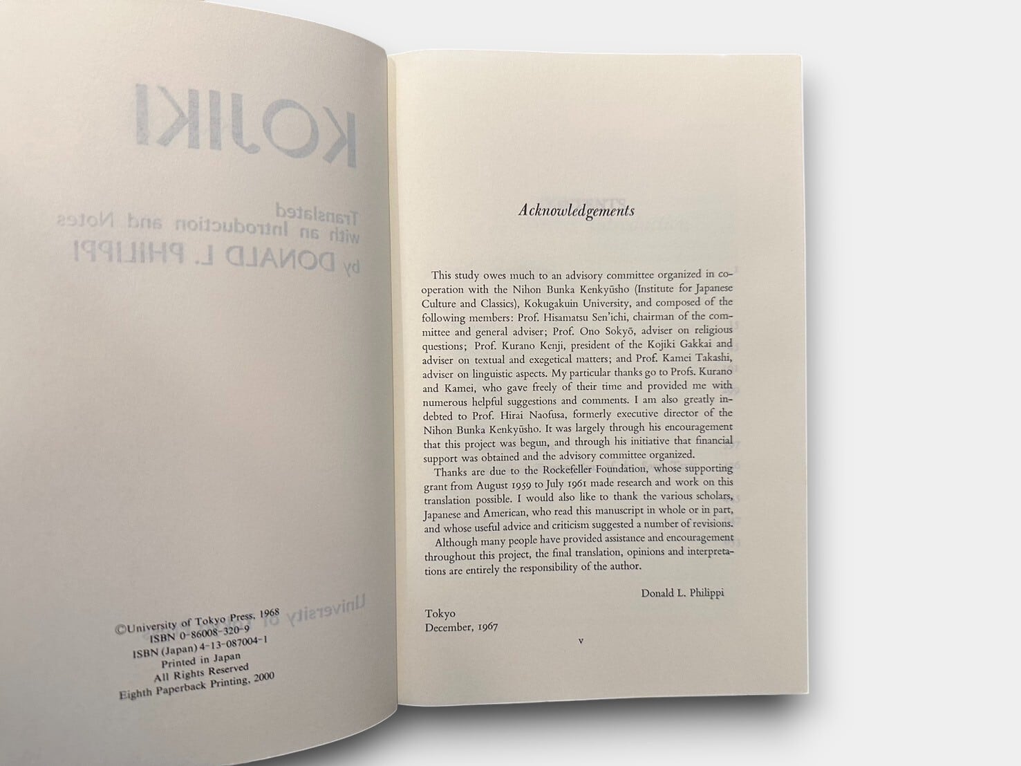 日本最古の書物である、日本の日本神話を含む歴史書『古事記』英訳本。日本語とアイヌ語の翻訳家、音楽家として著名な人物、ドナルド・L・フィリッパイ(Donald L. Philippi:1930-1993)による翻訳、序文、注釈付き。