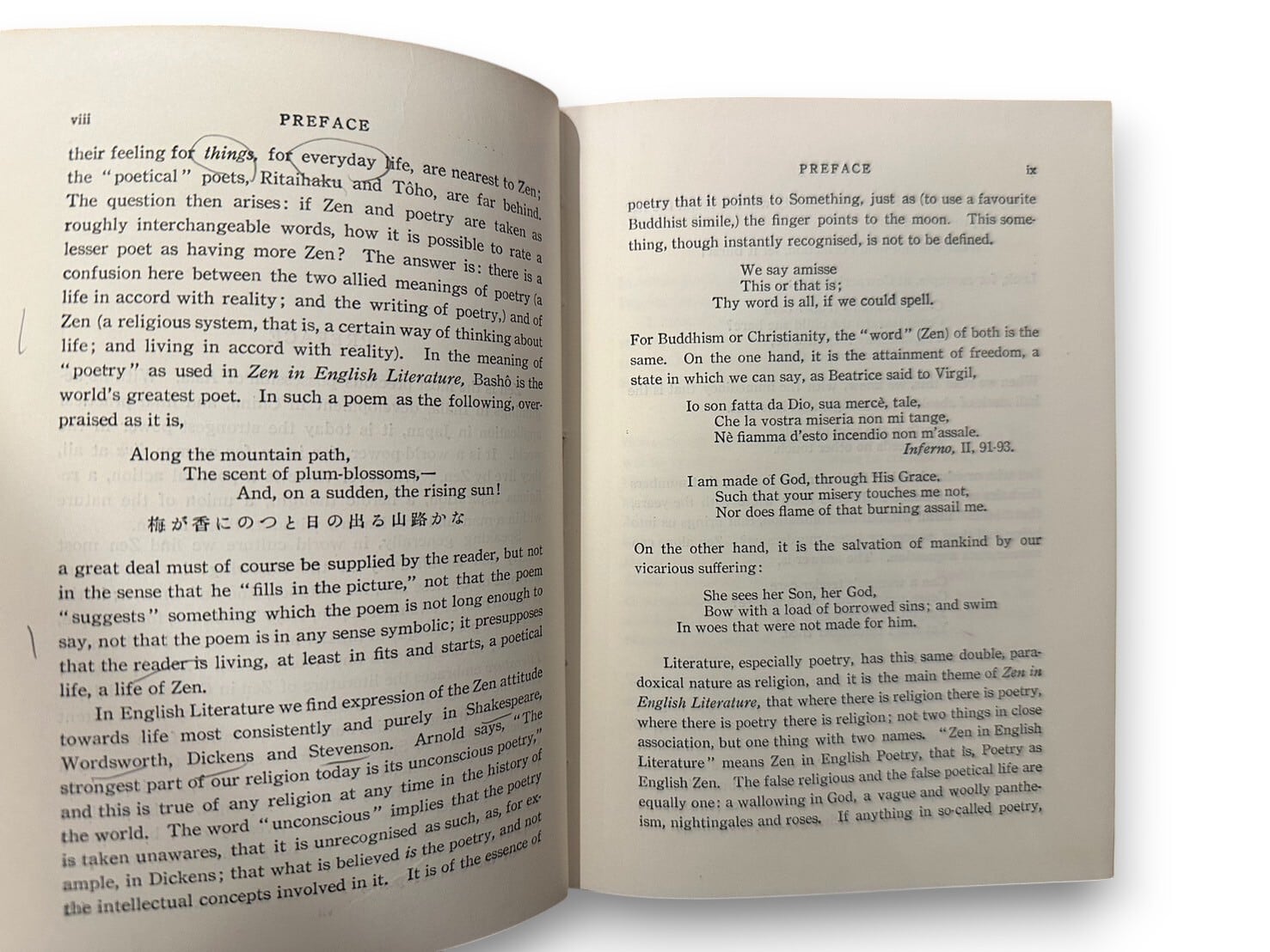 イギリス出身の文学者、日本文化研究者、レジナルド・ホーラス・ブライス(Reginald Horace Blyth:1898-1964)著書。文学作品の根底には禅の精神が流れていると考え研究を重ねたブライスの集大成とも呼べる1冊。膨大な量の中国・日本の古典、仏教書をひも解きながら、それに呼応するドイツ、フランス、イタリア、スペイン、イギリス文学のさまざまな作品と比較検討を加えている。邦訳は『禅と英文学』。昭和17年(1942)年に初版が出版された。本書は昭和42(1967)年に刊行されれた第10版。図版収録。