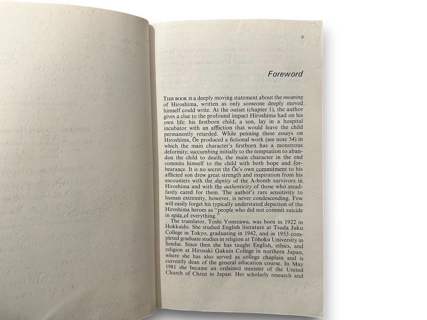 日本の小説家、大江 健三郎が1965年に著し岩波新書より刊行されたノンフィクション「ヒロシマ・ノート」英訳本。1945年8月6日に世界初の原子爆弾が投下された広島市を、大江は1963年に訪れ、原水爆禁止世界大会、原爆の被爆者、そして被爆者の治療に当たる医師たちを取材して著した。表題の「ヒロシマ」は単に原爆被災地「広島」を示すだけでなく広島・長崎をおそった今世紀最悪の「人間的悲惨」を象徴し、反核への意志「ノーモア・ヒロシマ」を含意している。