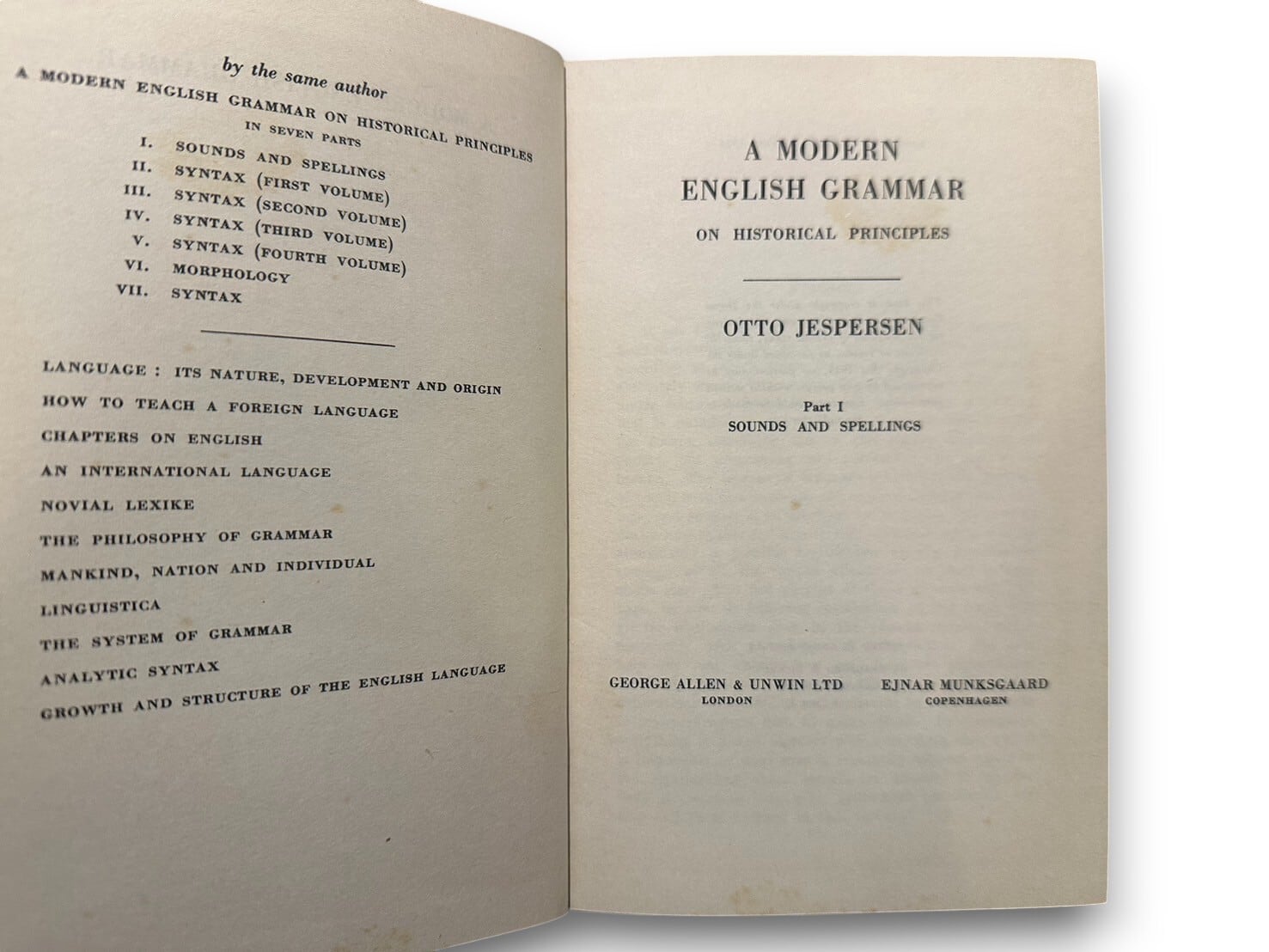 デンマークの言語学者、オットー・イェスペルセン(1860-1943)による英語文法論。初版は1909–1949年に刊行された。7冊セット揃い。