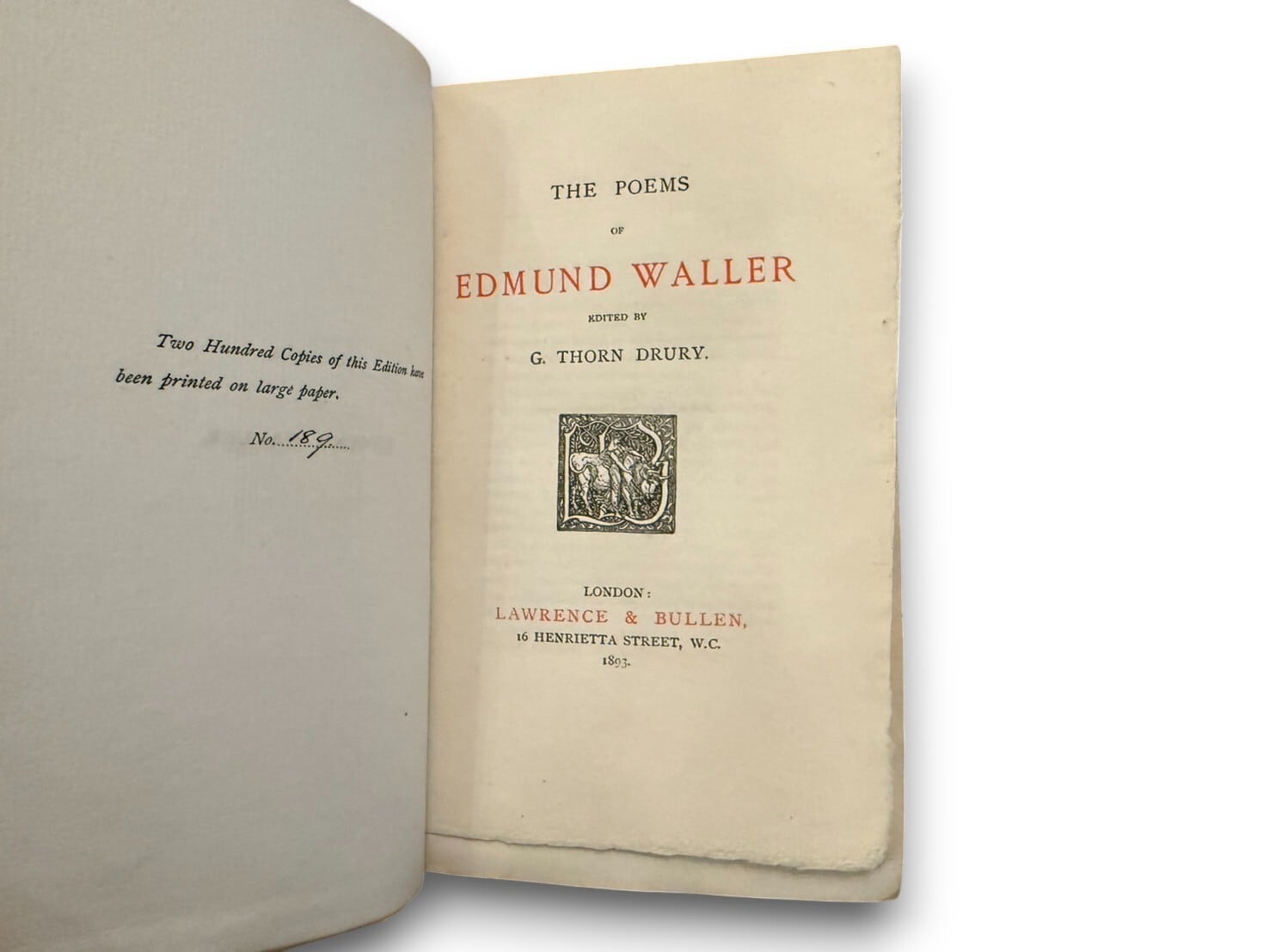 英国の詩人、エドマンド・ウォーラー(1606-1687)の詩集。代表作でもある『Go, lovely rose』収録。英雄対韻句(ヒロイック・カプレット)を用いて書かれるウォーラーの詩は、ジョン・ドライデンやジェラルド・ランバインらからも賞賛されていた。因みにウォーラーは英国の哲学者トマス・ホッブズ(1588-1679)から強い影響を受けており、ホッブズの『リヴァイアサン』を賞賛し、1642年に出版された 『市民論』(De Cive)では翻訳を申し出たといわれている。本書は1893年に刊行された200部限定うち189部。