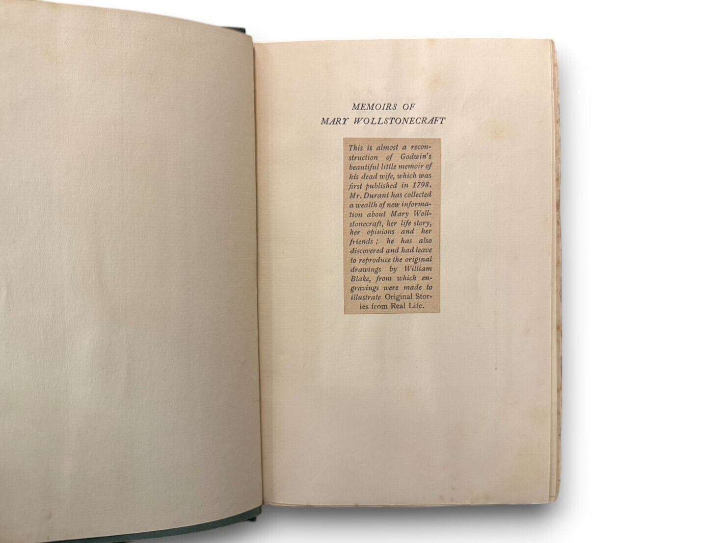 近代無政府主義の先駆者として知られるイギリスの政治評論家、ウィリアム・ゴドウィン(1756-1836)のよるゴドウィンの最初の妻であるイギリスの社会思想家、メアリ・ウルストンクラフト(1759-1797)の回想録。ウルストンクラフトは、フェミニズムの先駆者であり、「人類がもっと高い道徳性を身につけ、そしてもちろん、もっと幸福になるためには、男女は同じ原理に基づいて行動しなければならない」という主張の元展開した著書『A Vindication of the Rights of Woman』が有名である。なお、ゴドウィンとウルストンクラフトの間に産まれた娘、メアリ・ウルストンクラフト・ゴドウィンは後にロマン派詩人パーシー・ビッシュ・シェリーと結婚し、小説『フランケンシュタイン』の作者として名高いメアリ・シェリーである。(ウルストンクラフトはメアリの出産からわずか11日後、38歳で産褥熱のため死亡した。)限定700部。