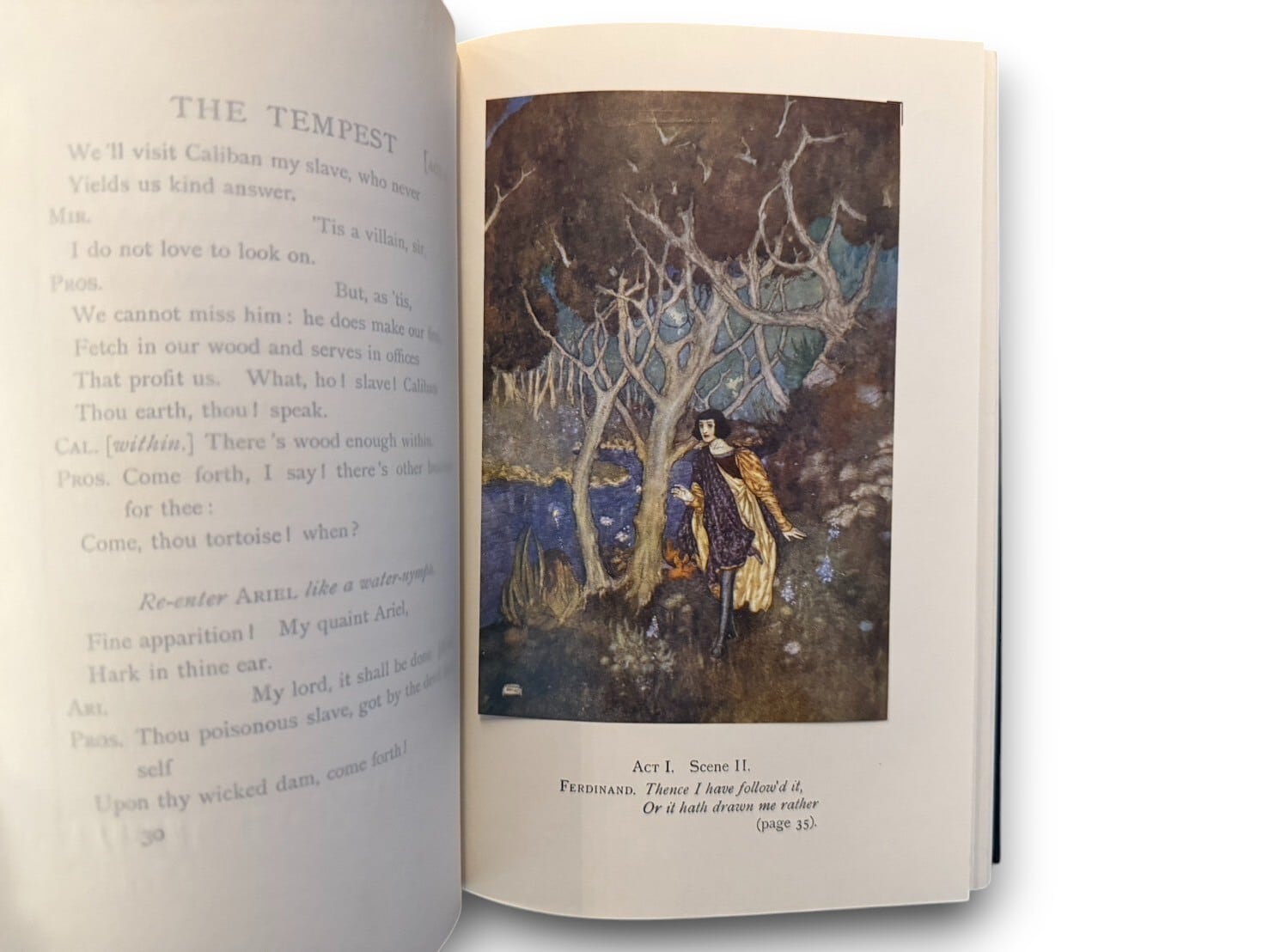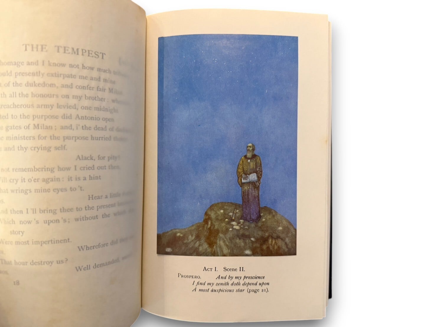 英国の劇作家ウィリアム・シェイクスピア作の戯曲『テンペスト』。「テンペスト」は「嵐」を意味し、日本では『あらし』の題名でも上演される。シェイクスピア単独の執筆としては最後の作品と言われる。シェイクスピアが書いた中でも人気の高い作品で、2012年のロンドン・オリンピック開会式では、物語の舞台となる魔法の島を模したセットで作品の一部が朗読されるなど重要な役割を果たした。挿絵は「挿絵の黄金時代」にイギリスで活躍したフランス出身のイギリスの挿絵画家、エドマンド・デュラック(1882-1953)が手掛けている。初版は1908年刊行。本書は1982年に刊行された限定版。