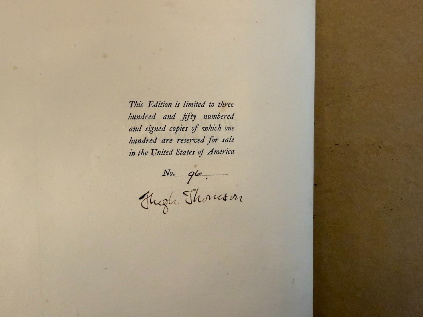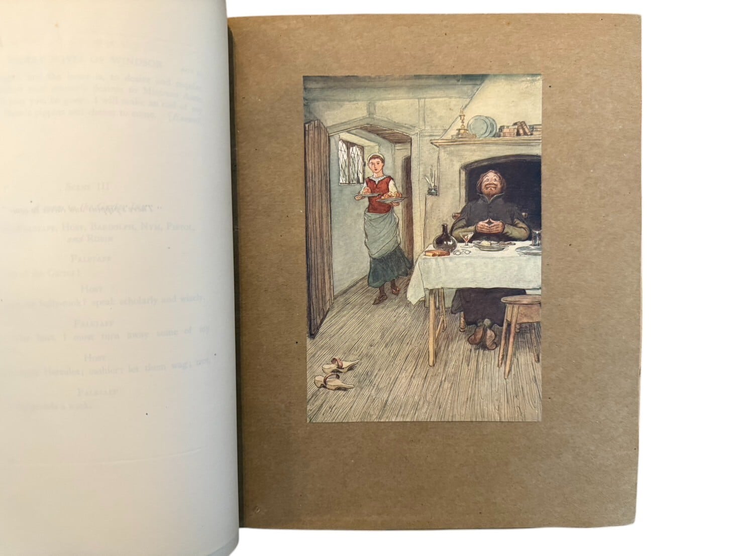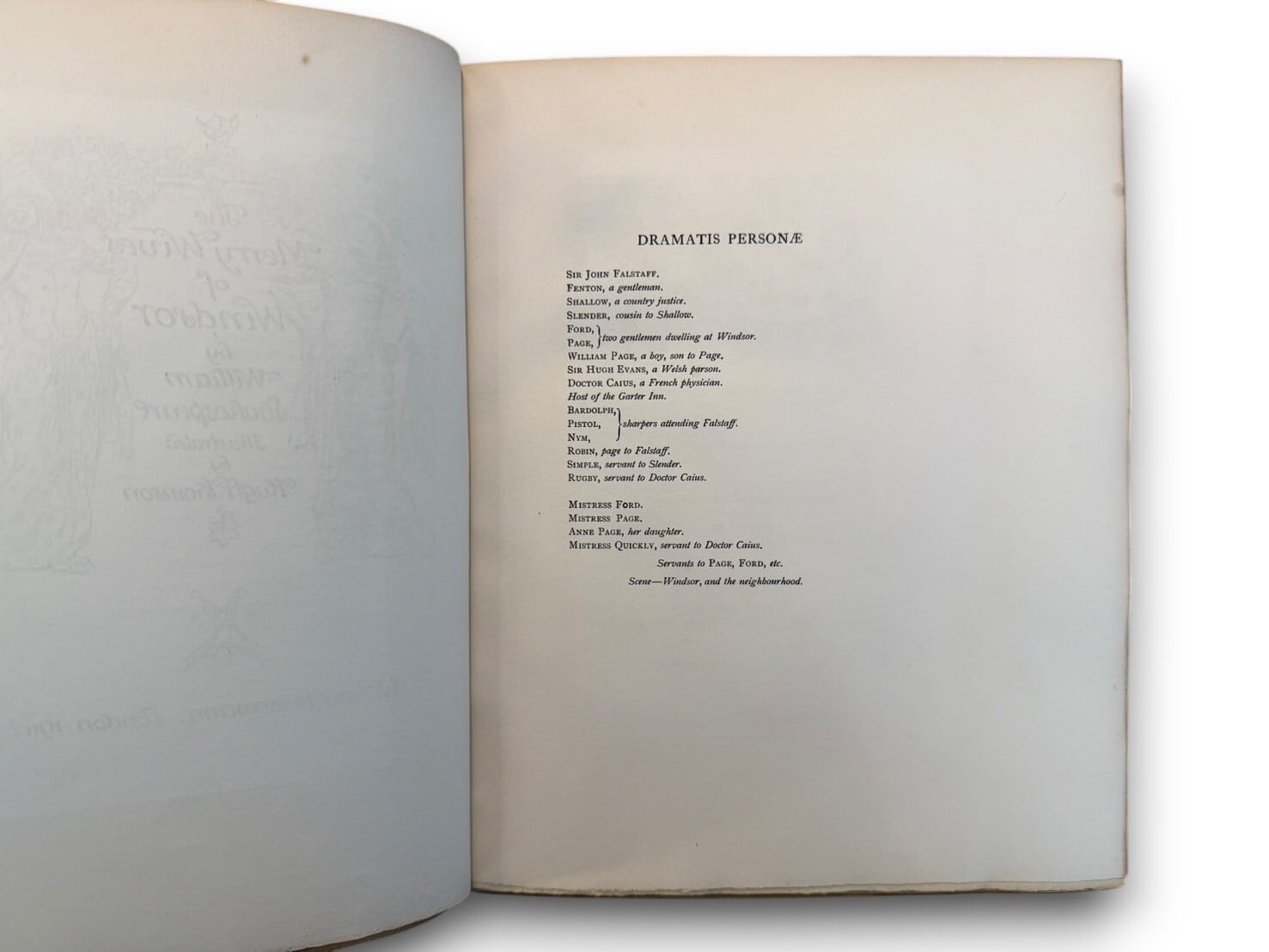 ウィリアム・シェイクスピア作の喜劇『ウィンザーの陽気な女房たち』。ヘンリー4世の治世頃を扱っているはずであるが、一切辻褄合わせなどはせずに同時代のエリザベス朝イングランドの中流階級の生活を扱っており、シェイクスピアとしては唯一の「現代劇」とされている。挿絵はアイルランドのイラストレーター、ヒュー・トムソン(1860-1920)が手掛けている。初版限定版350部うち96部。ヒュー・トムソン署名入り。