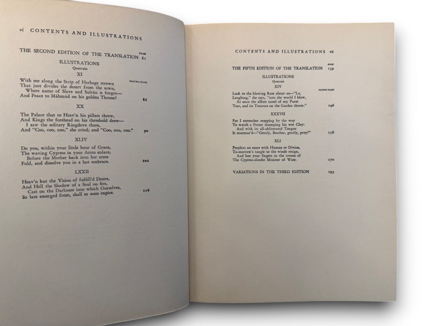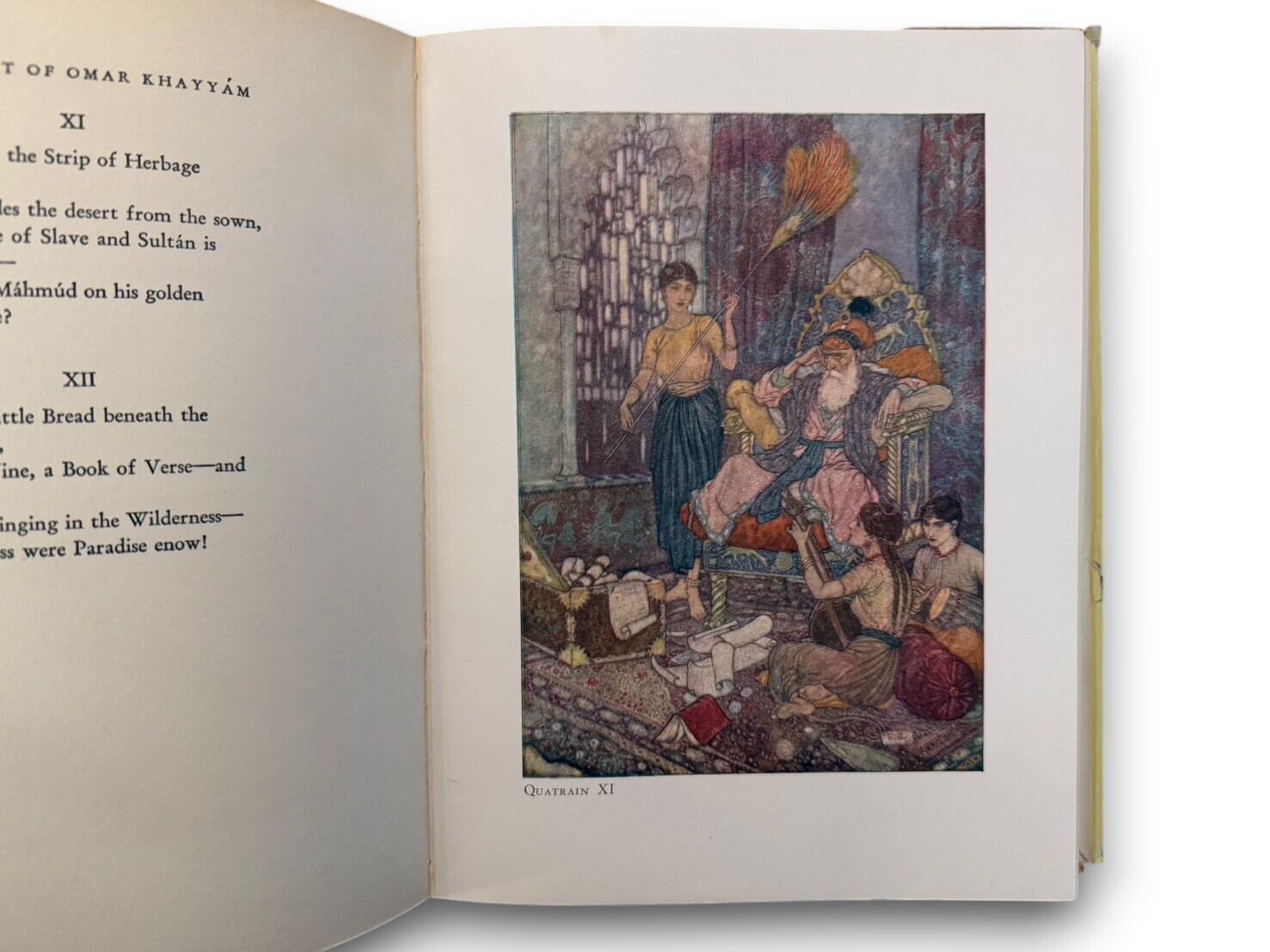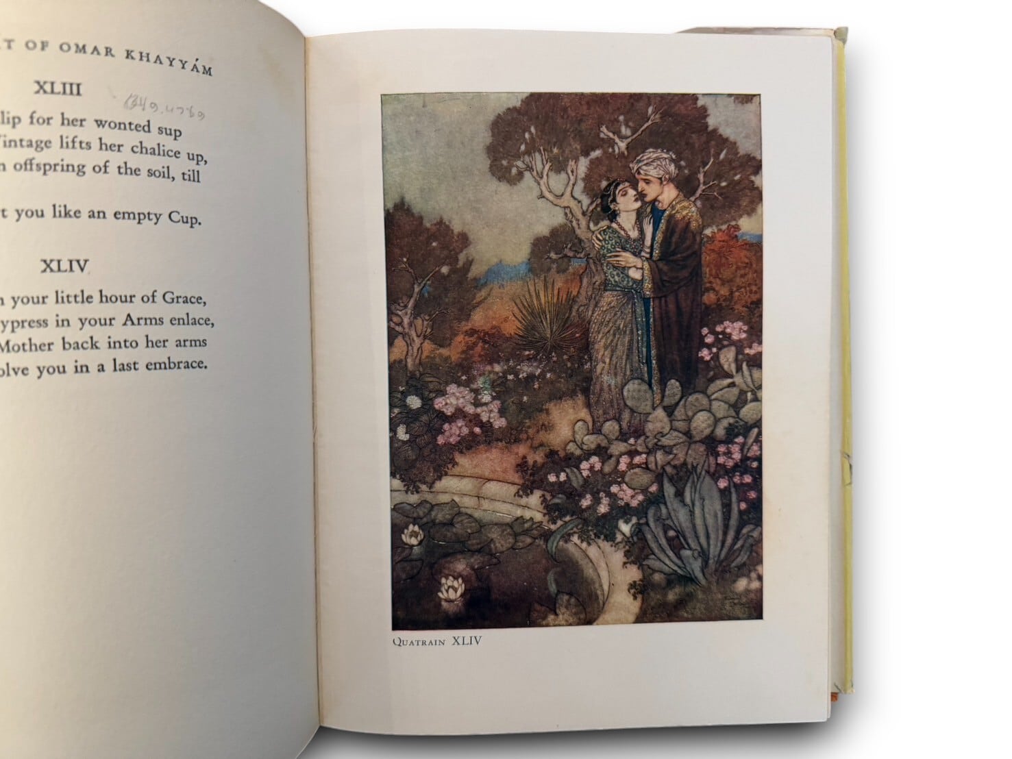 11世紀ペルシア(イラン)の詩人ウマル・ハイヤームの四行詩集。19世紀イギリスの詩人、エドワード・フィッツジェラルドによる英語訳。挿絵は「挿絵の黄金時代」にイギリスで活躍したフランス出身のイギリスの挿絵画家、エドマンド・デュラック(1882-1953)が担当している。